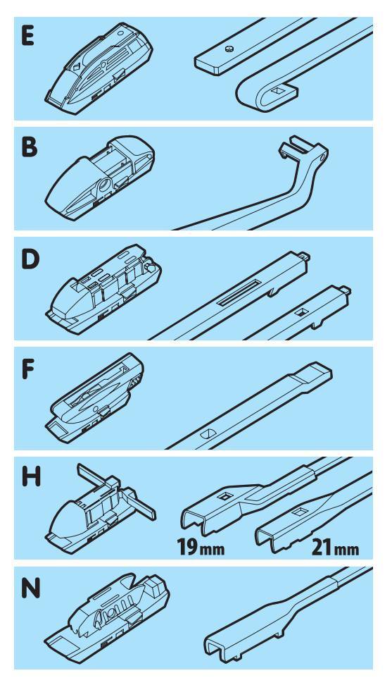 • 1 raccordo per il montaggio su tutte le vetture equipaggiate con tergicristalli tradizionali.