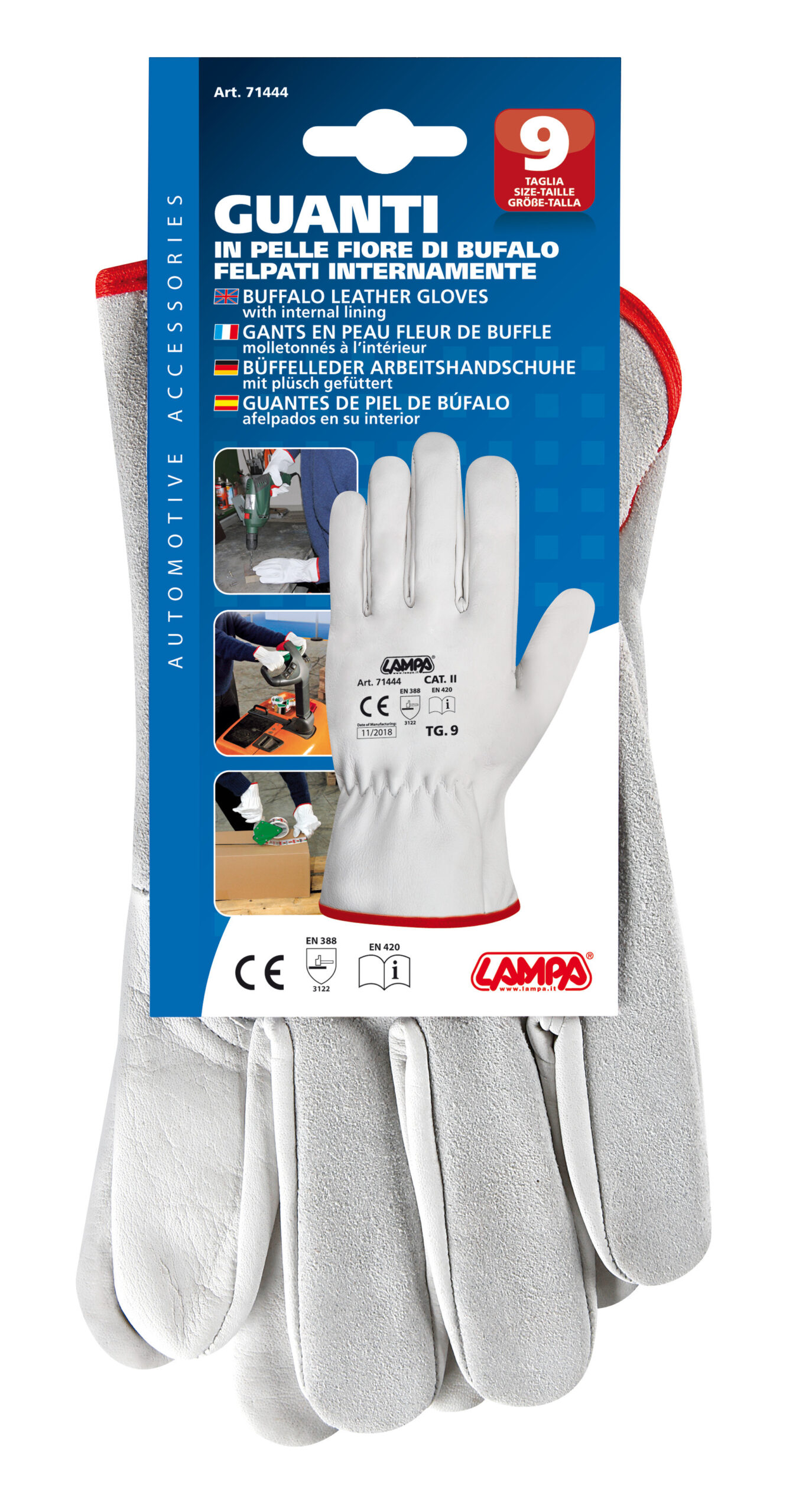 Guanti in pelle fiore di bufalo orlato, felpato internamente. Spessore della pelle: 1,0-1,30 mm. Ottima aderenza, sensibilità e morbidezza, ideali per la conduzione di automezzi, carico e scarico merci, settore agricolo, meccanico, metalmeccanico…