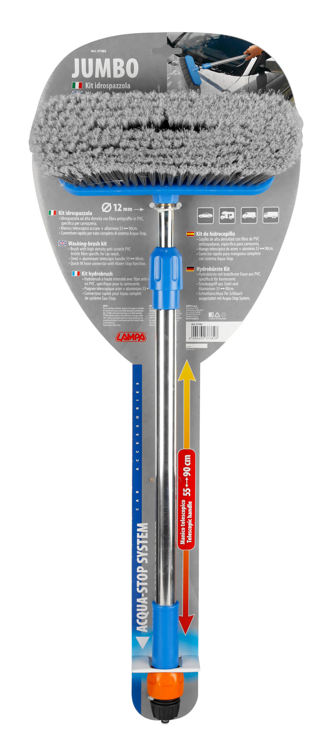 Idrospazzola ad alta densità con fibra antigraffio, specifica per carrozzeria. Manico telescopico cm 55-90 cm. Connettore rapido per tubo completo di sistema acqua-stop.