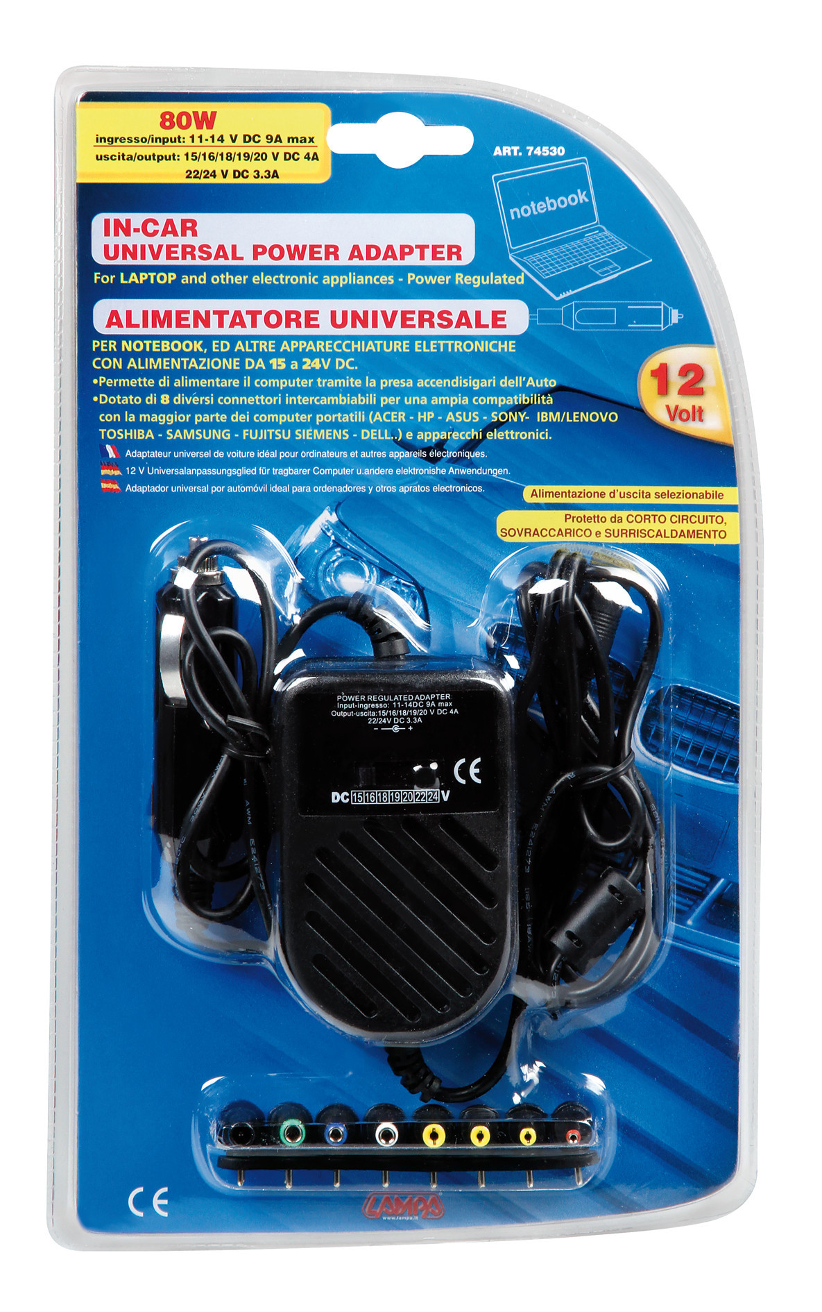 Con alimentazione d’uscita selezionabile da 15 a 24V tramite 8 connettori intercambiabili. Per notebook, ed altre apparecchiature elettroniche (80W max). Protezione contro corto circuito, sovraccarico e surriscaldamento