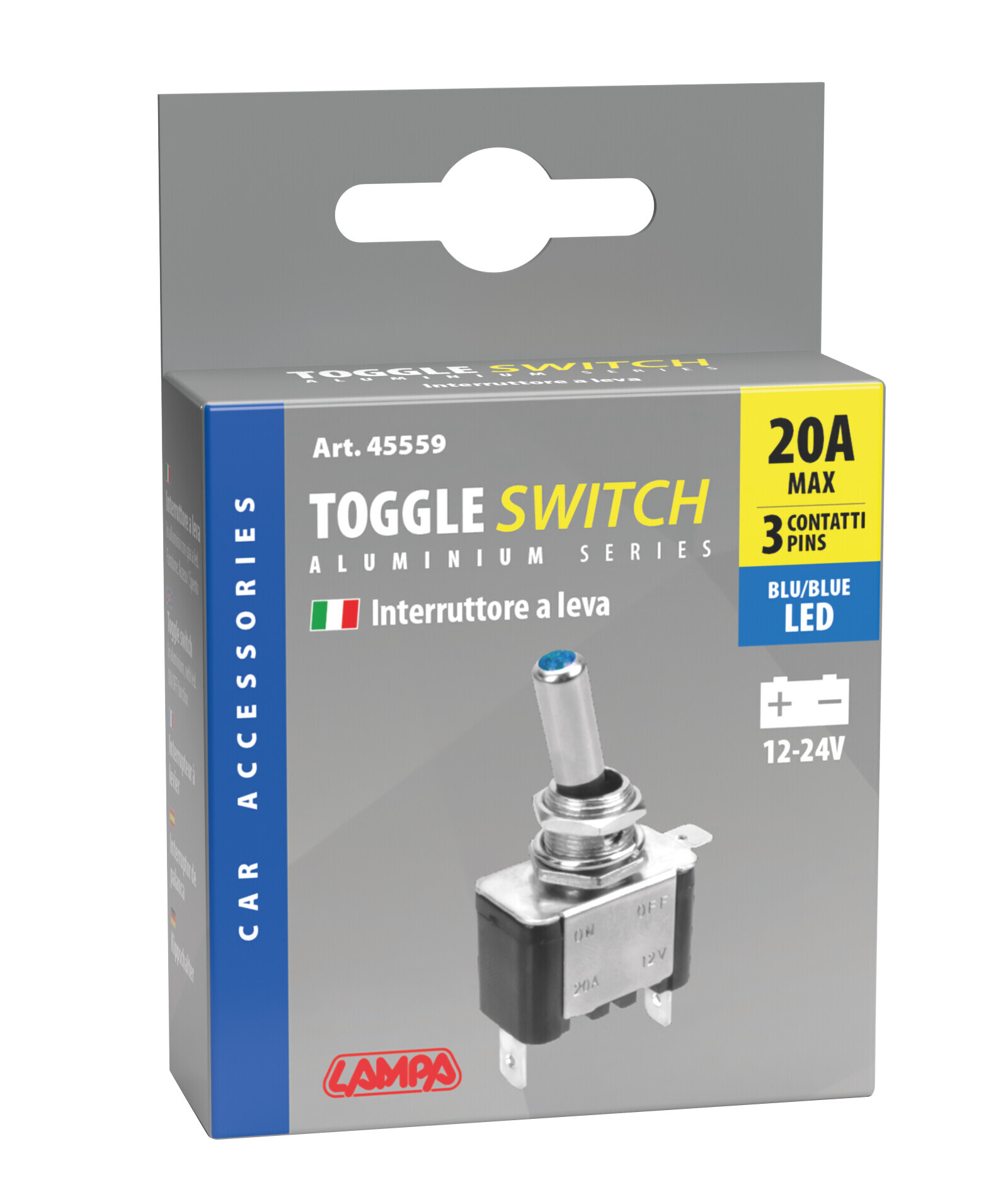Interruttore a leva, in alluminio con spia a Led – 12/24V – Blu – 20A