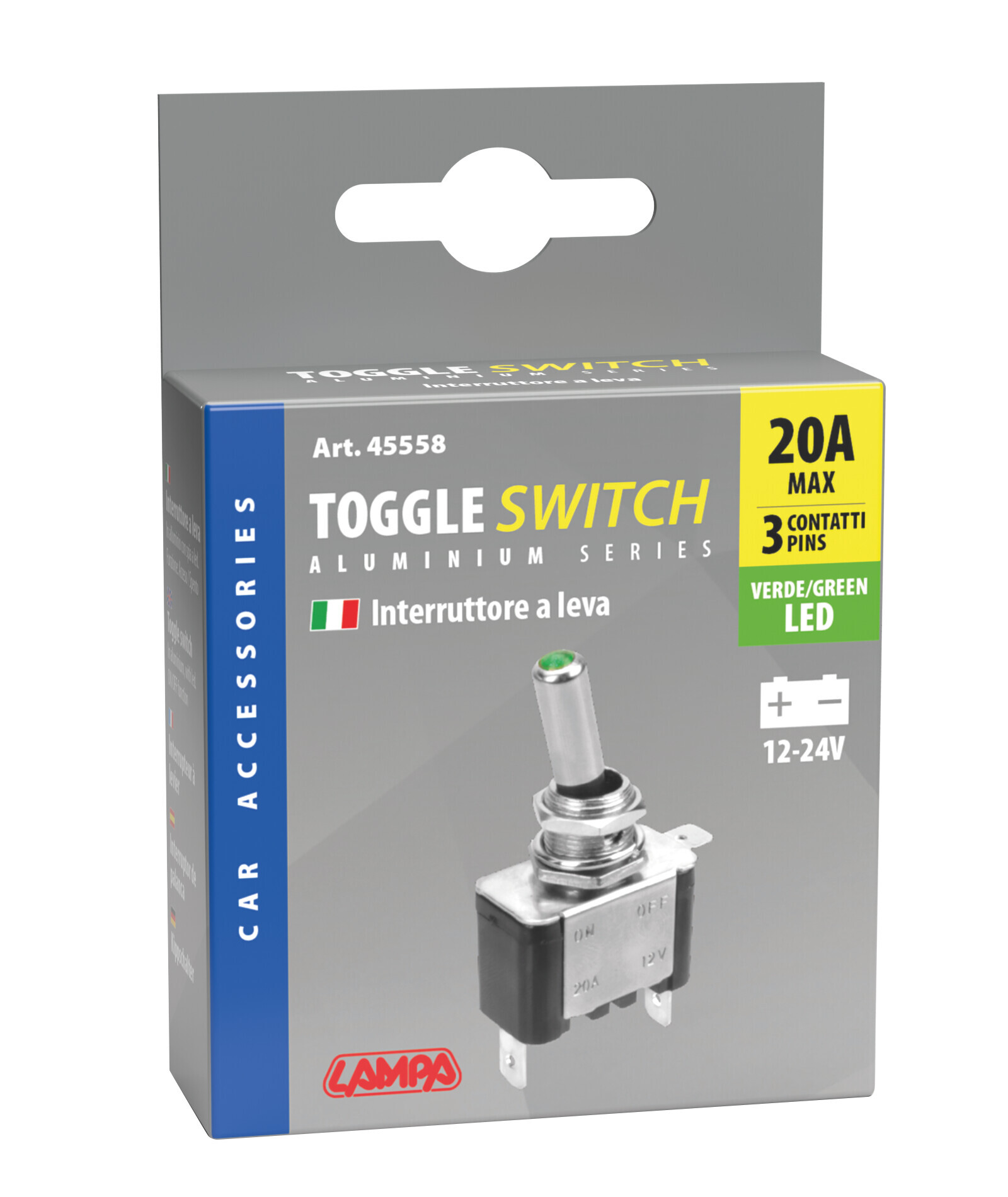 Interruttore a leva, in alluminio con spia a Led – 12/24V – Verde – 20A