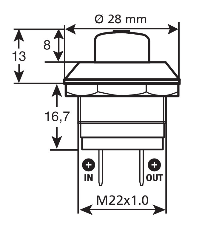 10A max. Funzione: attivazione temporanea a pressione. 2 contatti. Foro Ø 22 mm. Spessore max 6 mm.