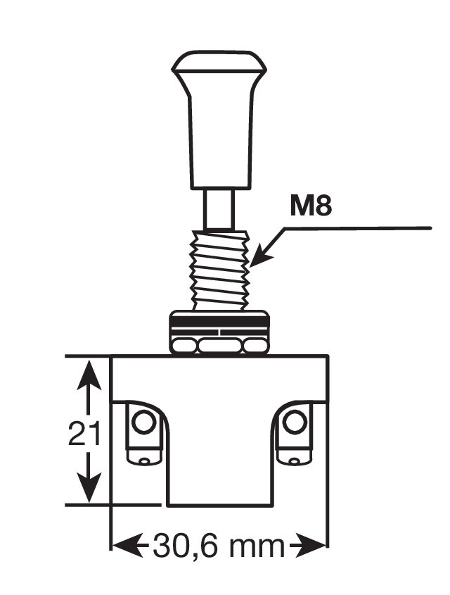 10A max. Funzione:Acceso/Spento. 2 contatti. Foro Ø 8,5 mm. Spessore max 10 mm.