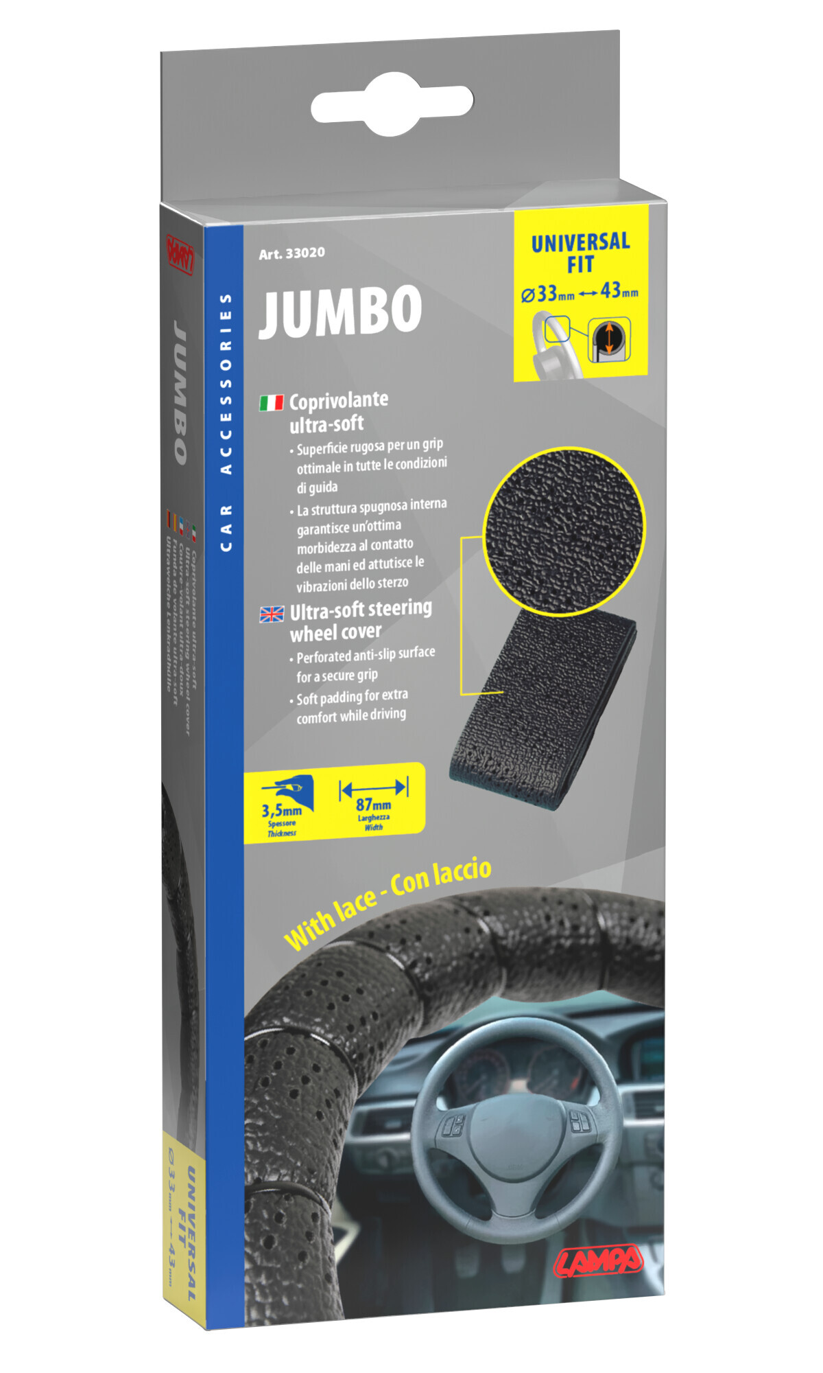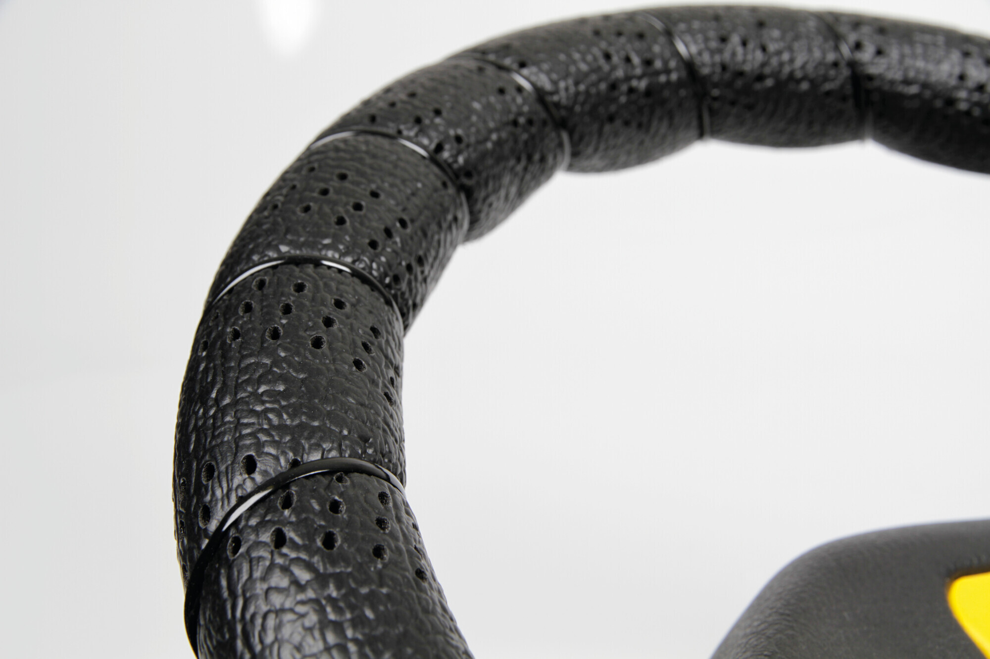 Realizzato in PVC, spessore 3,5 mm, larghezza 87 mm. Aumenta il diametro del volante per una presa più sportiva. La superficie forata e rugosa assicura un grip ottimale e una buona ventilazione alle mani. La struttura spugnosa interna dona una piacevole sensazione di morbidezza e attutisce le vibrazioni dello sterzo.