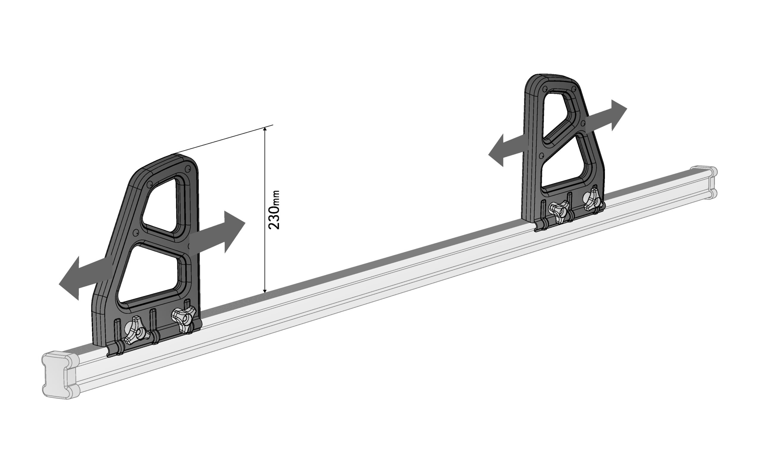 Scorrevoli lungo la barra e serrabili tramite pomelli senza l’ausilio di utensili. Mantengono in posizione scale, tavole, assi ed altri carichi, anche voluminosi.