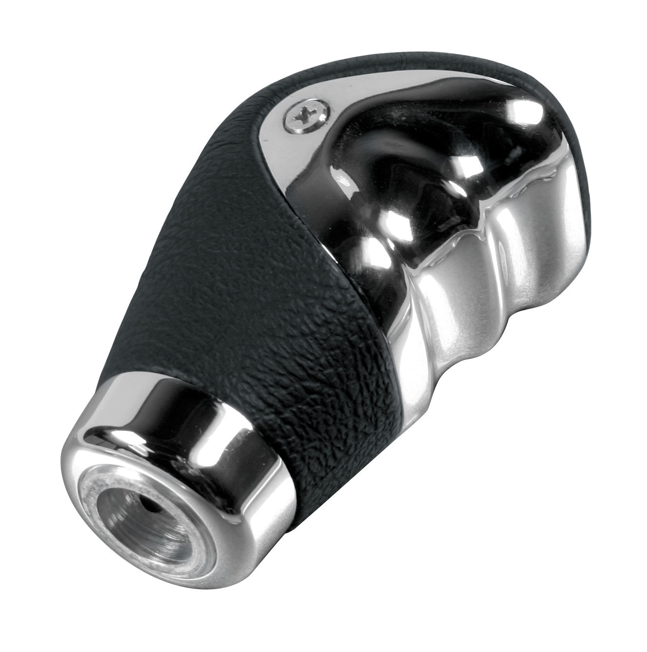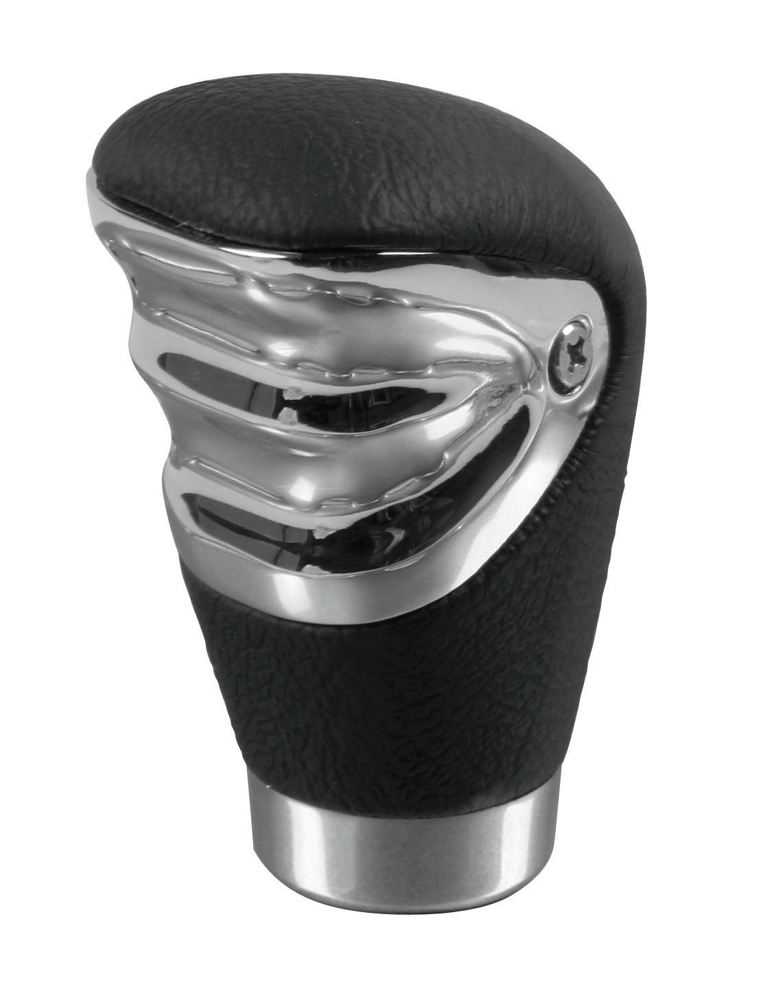 Pomello leva cambio in pelle con inserti in alluminio cromato.