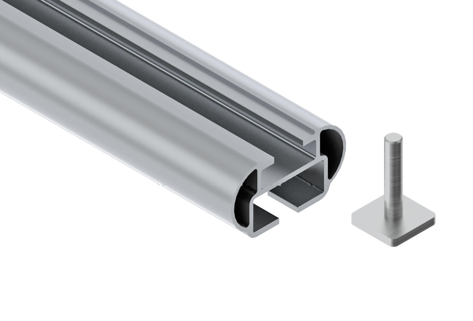– Robusto profilo tubolare in lega di alluminio anodizzato, con predisposizione per l’inserimento dei connettori rapidi “T” all’interno della canalina superiore.