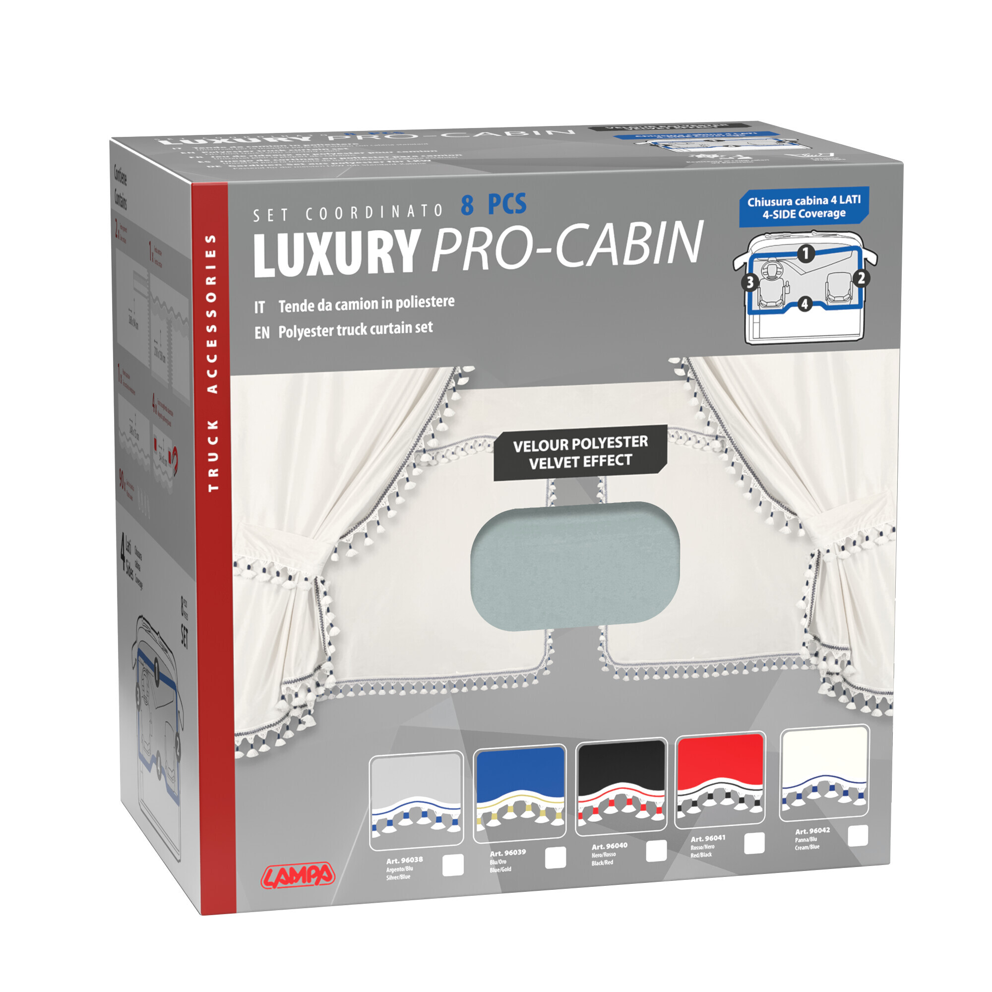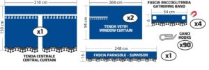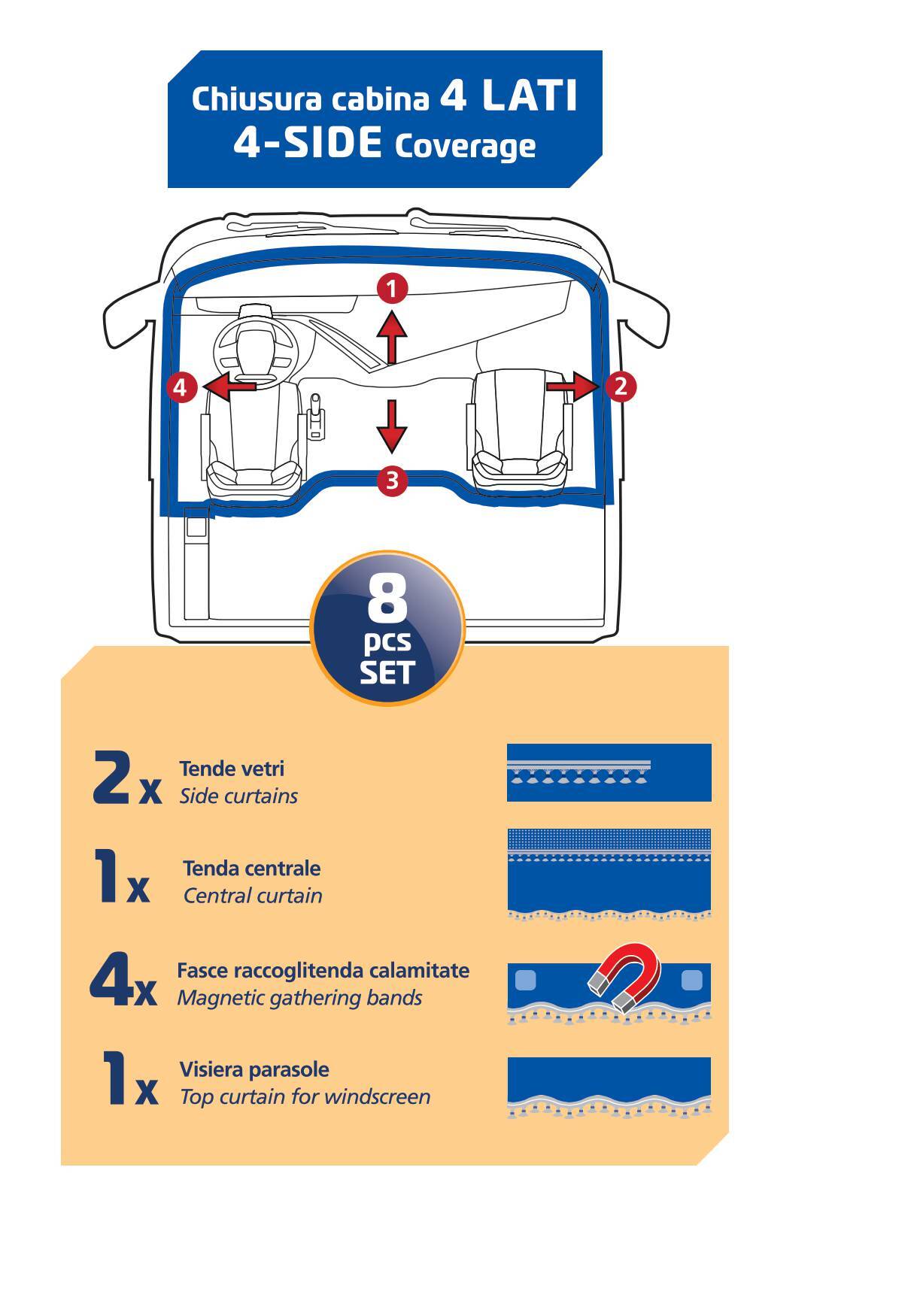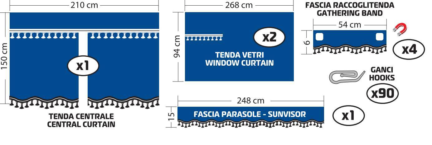 Composto da: 2 tende vetri, 1 tenda centrale, 1 fascia parasole, 4 fasce raccoglitenda calamitate, 90 ganci in plastica. Universale per la maggior parte dei camion a cabina standard