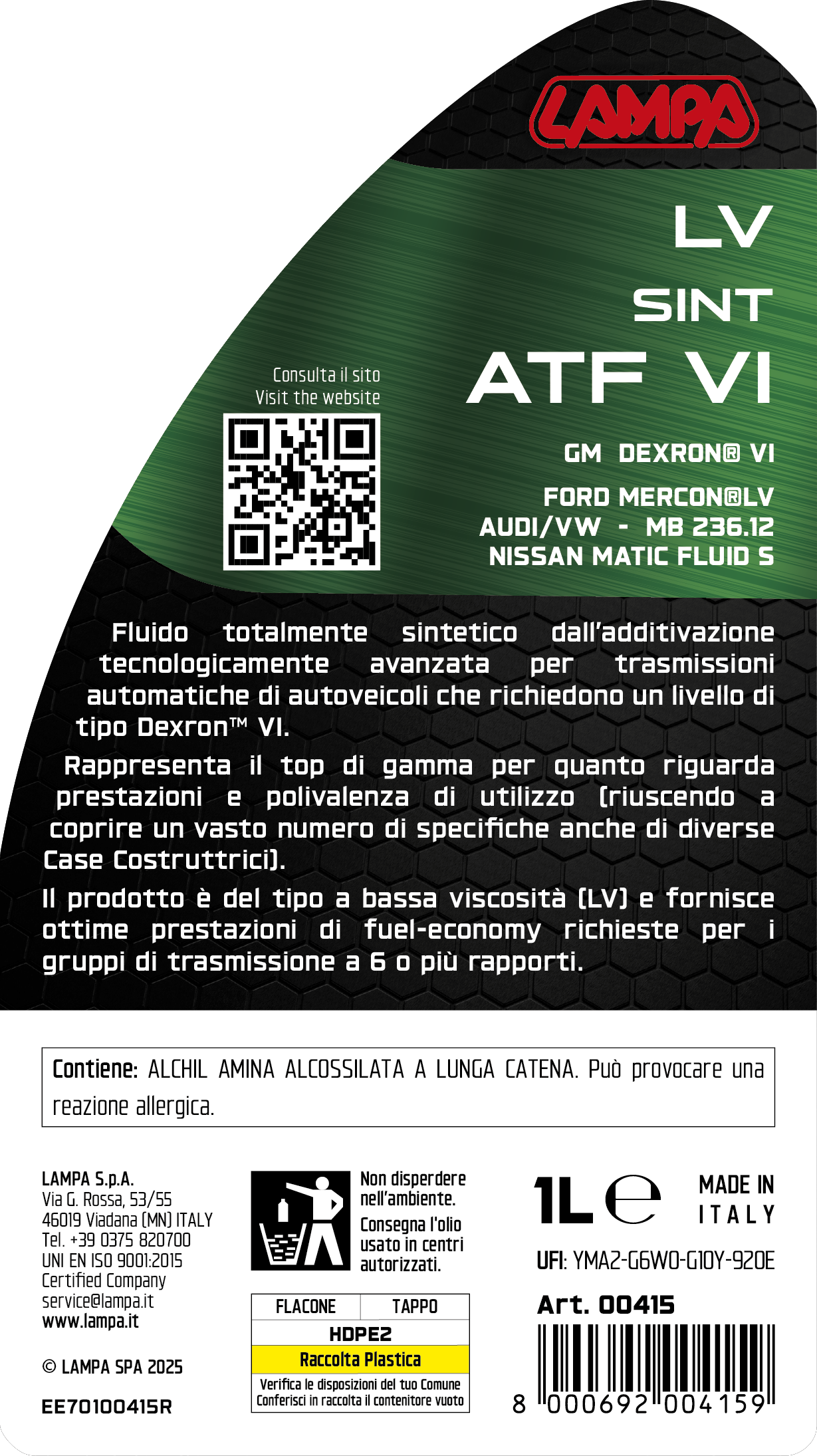 Fluido totalmente sintetico dall’additivazione tecnologicamente avanzata per trasmissioni automatiche di autoveicoli che richiedono un livello di tipo Dexron™ VI.