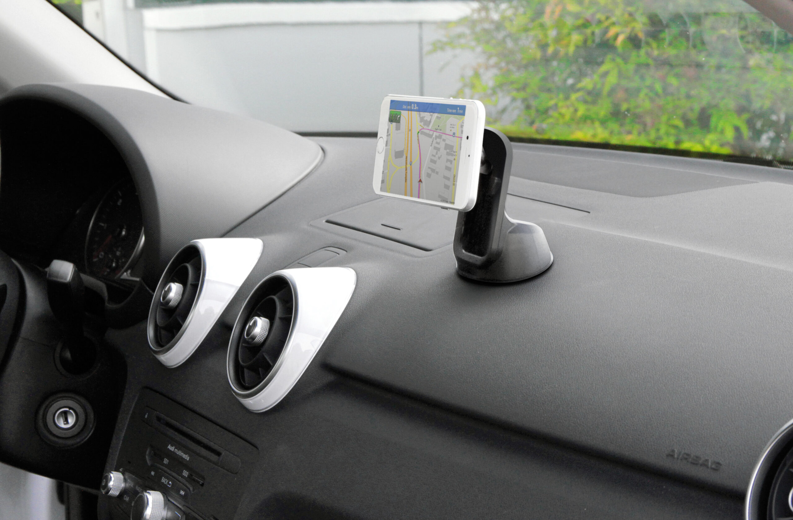• Ventosa adesiva per una presa ottimale su parabrezza e cruscotti.