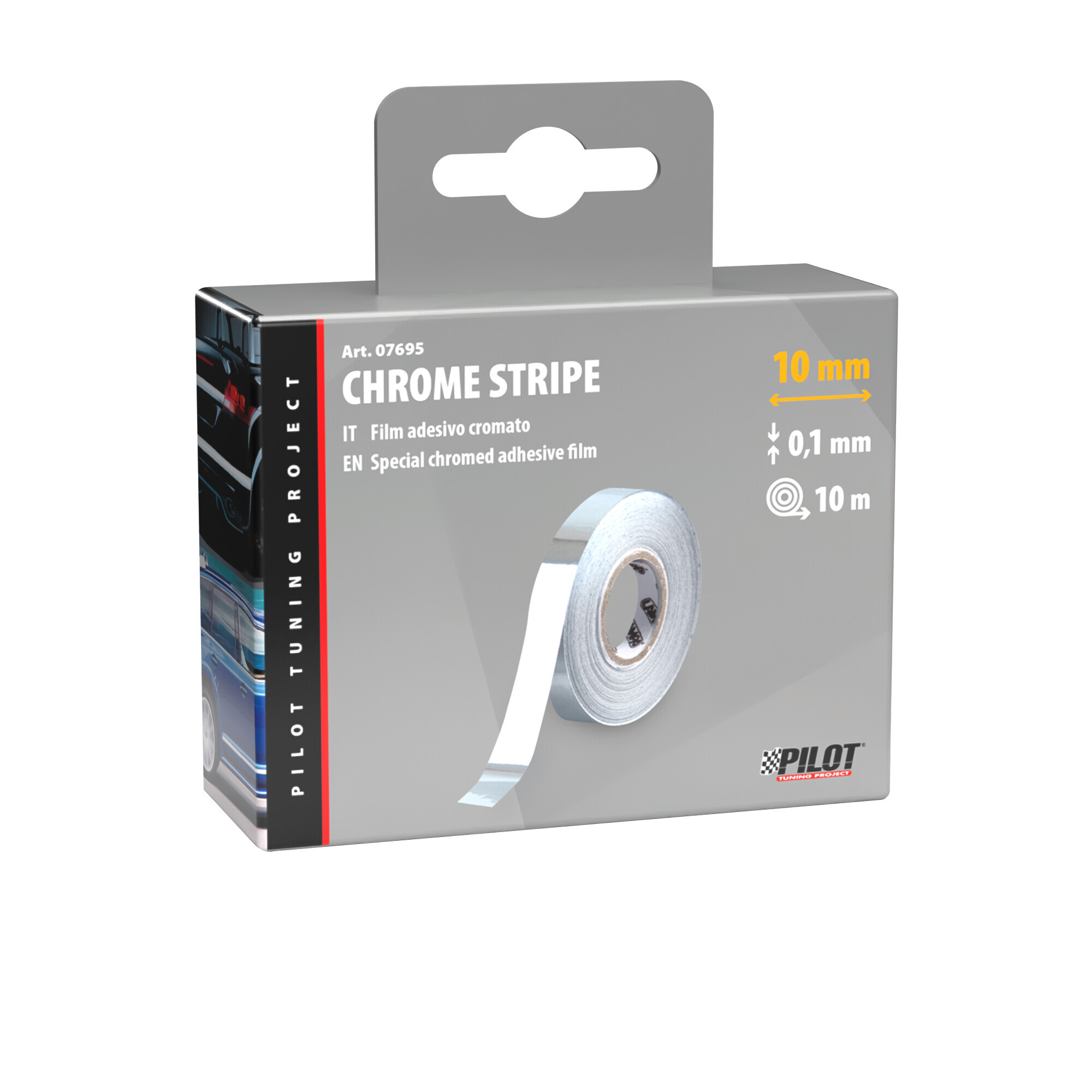 Film adesivo cromato ultrasottile, adatto per l’applicazione su tutte le superfici lisce in plastica, metallo, vetro…Resistente ai raggi UV ed impermeabile, idoneo per uso interno ed esterno. Kit applicazione completo di cutter e spatola