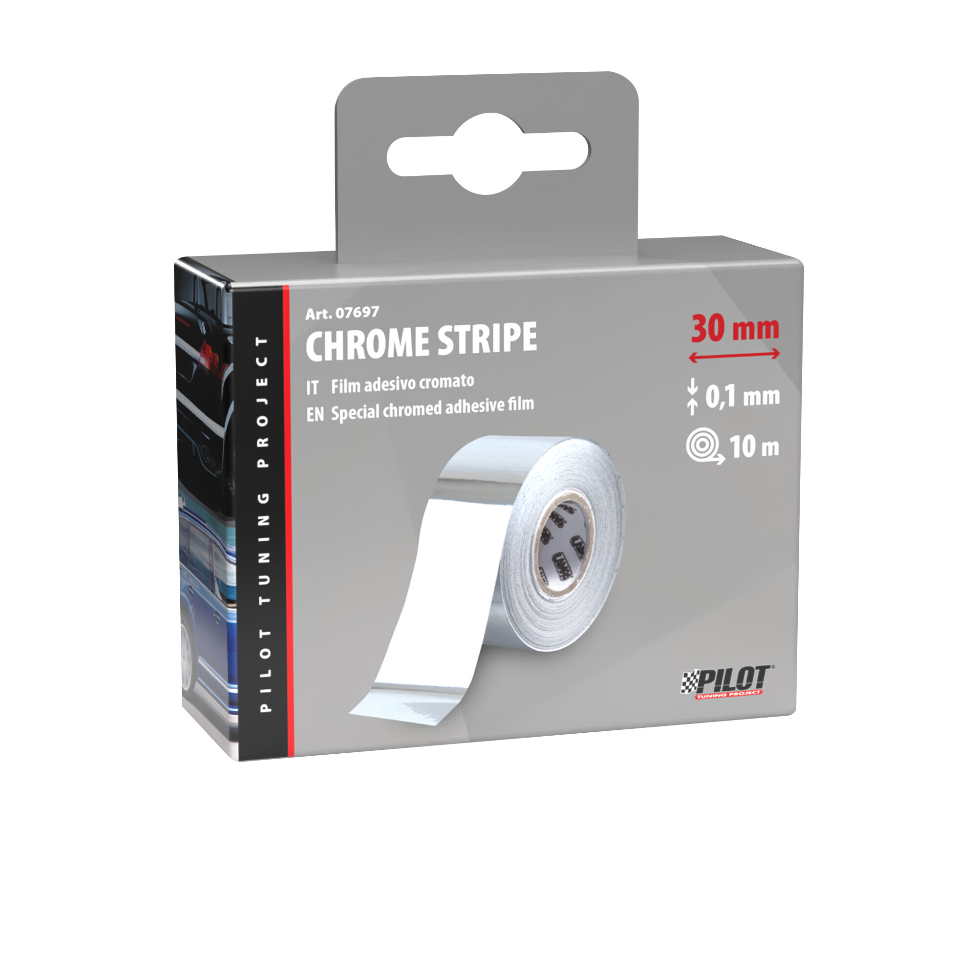 Film adesivo cromato ultrasottile, adatto per l’applicazione su tutte le superfici lisce in plastica, metallo, vetro…Resistente ai raggi UV ed impermeabile, idoneo per uso interno ed esterno. Kit applicazione completo di cutter e spatola