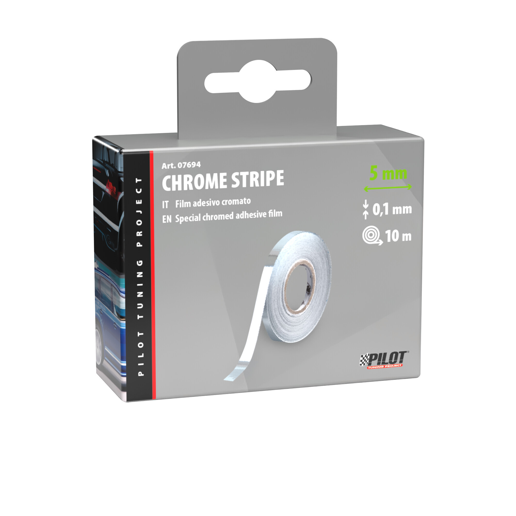 Film adesivo cromato ultrasottile, adatto per l’applicazione su tutte le superfici lisce in plastica, metallo, vetro…Resistente ai raggi UV ed impermeabile, idoneo per uso interno ed esterno. Kit applicazione completo di cutter e spatola