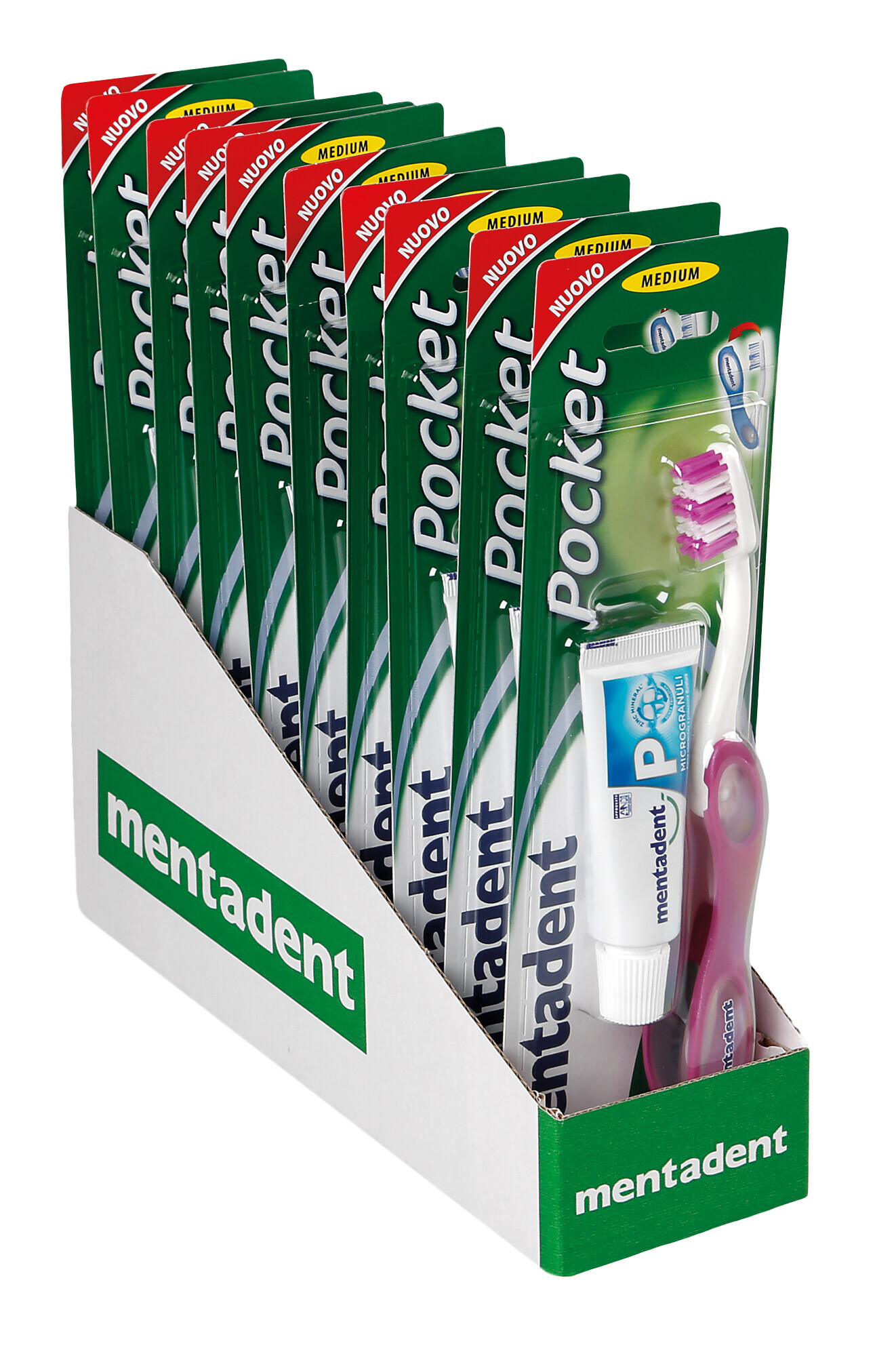 Mentadent, Kit spazzolino e dentifricio “Pocket” – Confezione da 10 pezzi (Colori assortiti)