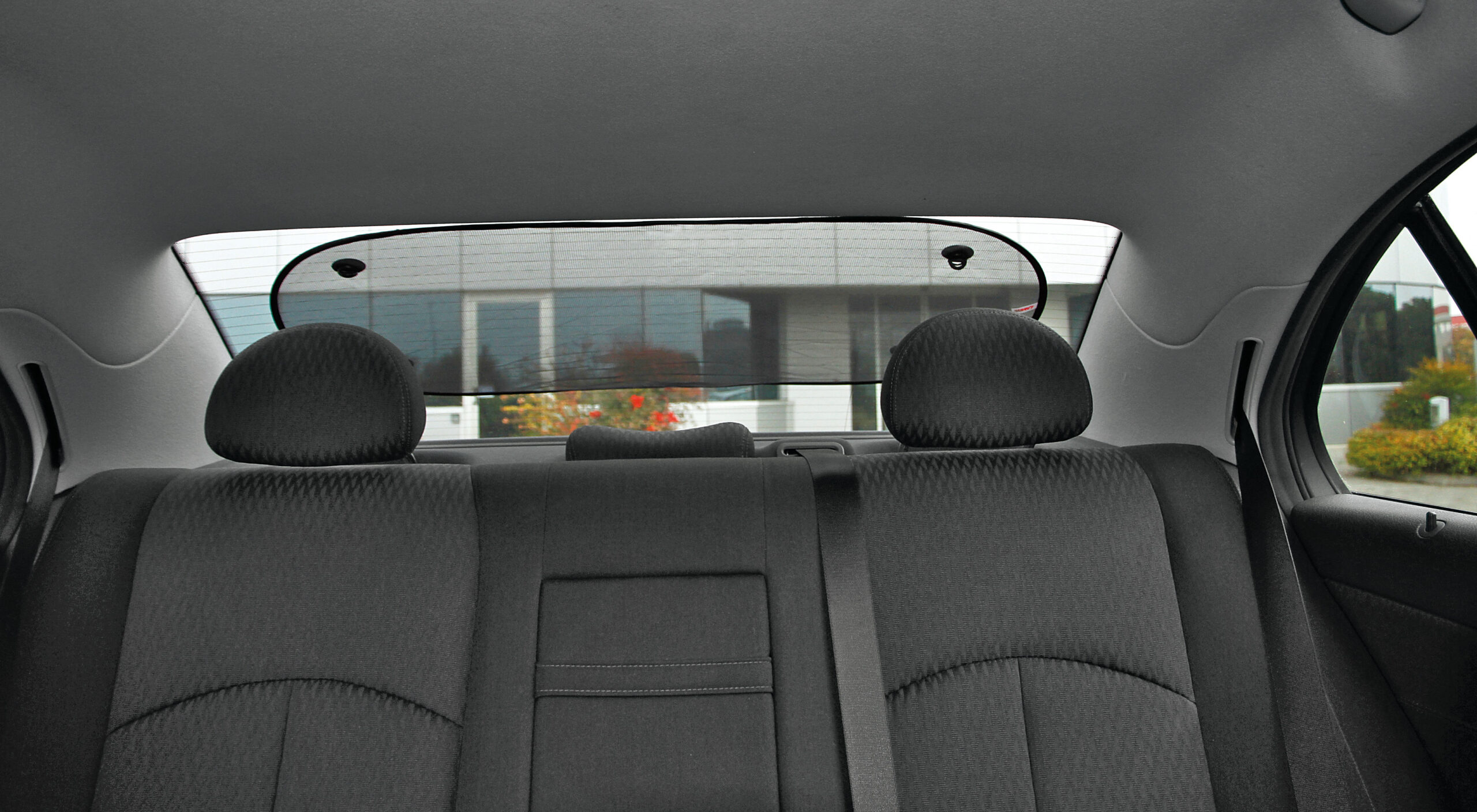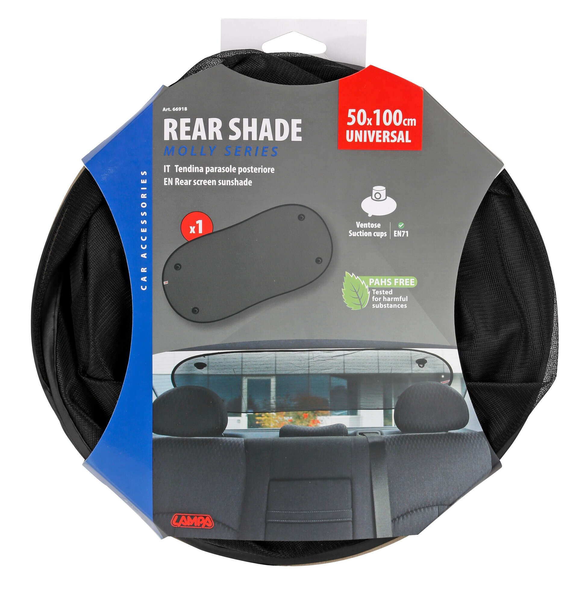 In seta di poliestere nera, con ventose. Si applica al lunotto posteriore. La molla di contorno tiene la tela costantemente tesa