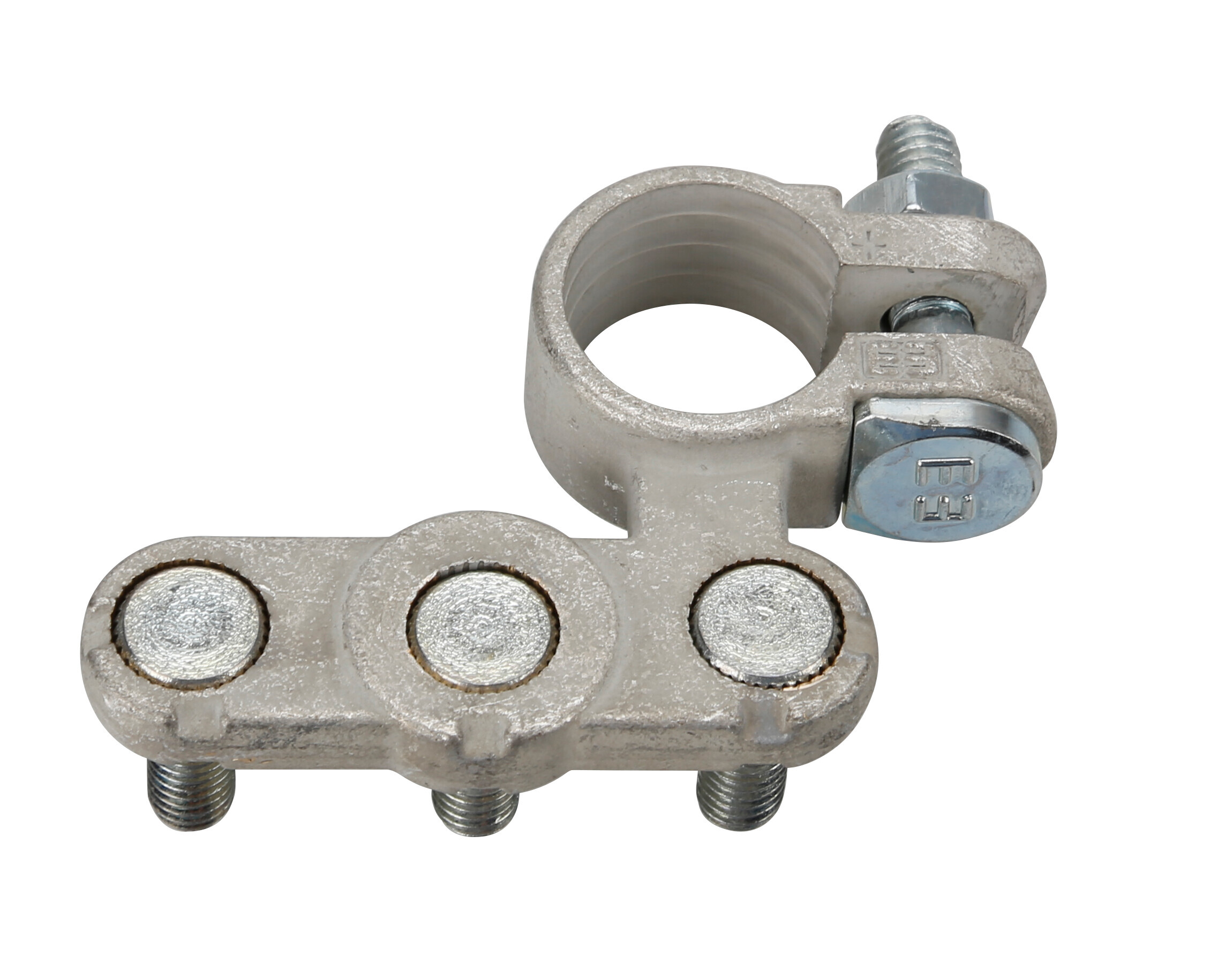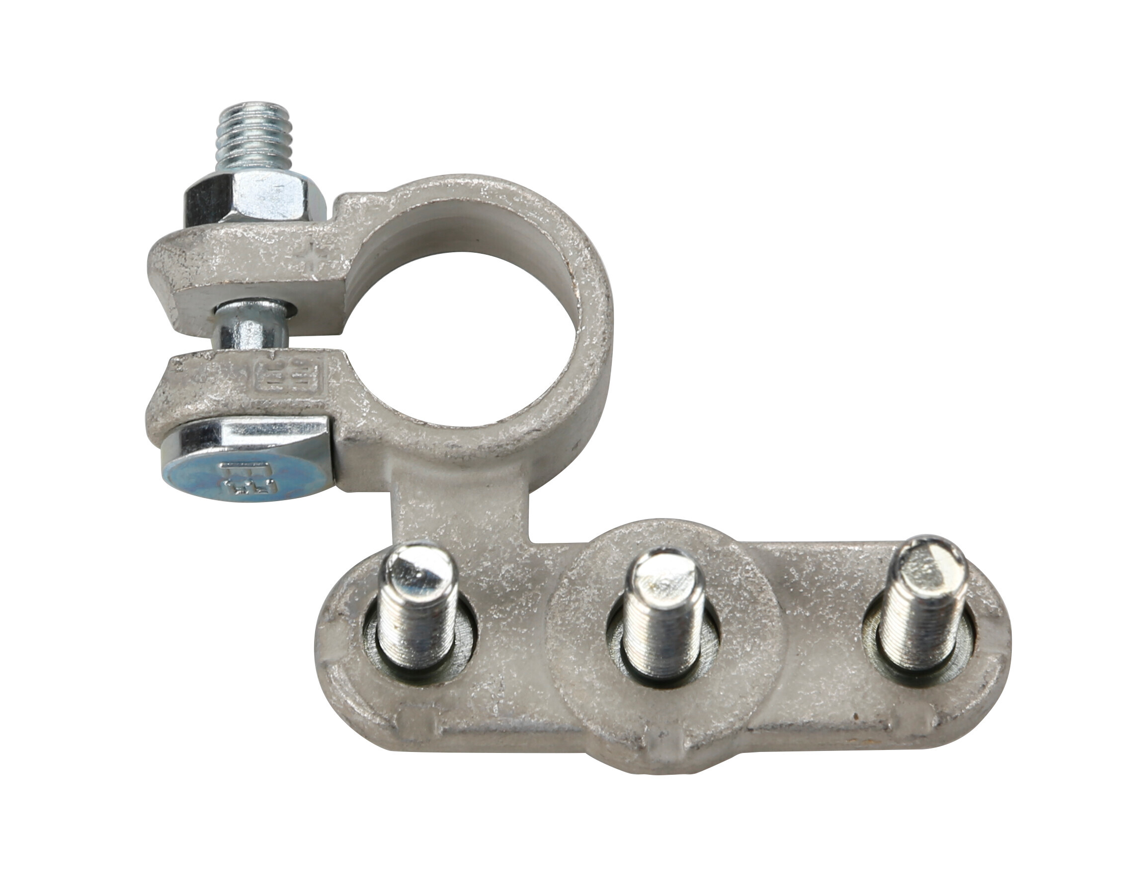Morsetto batteria zincato; fissaggio cavo a capocorda su vite – foro capocorda Ø 6/6/6 mm – Polo positivo