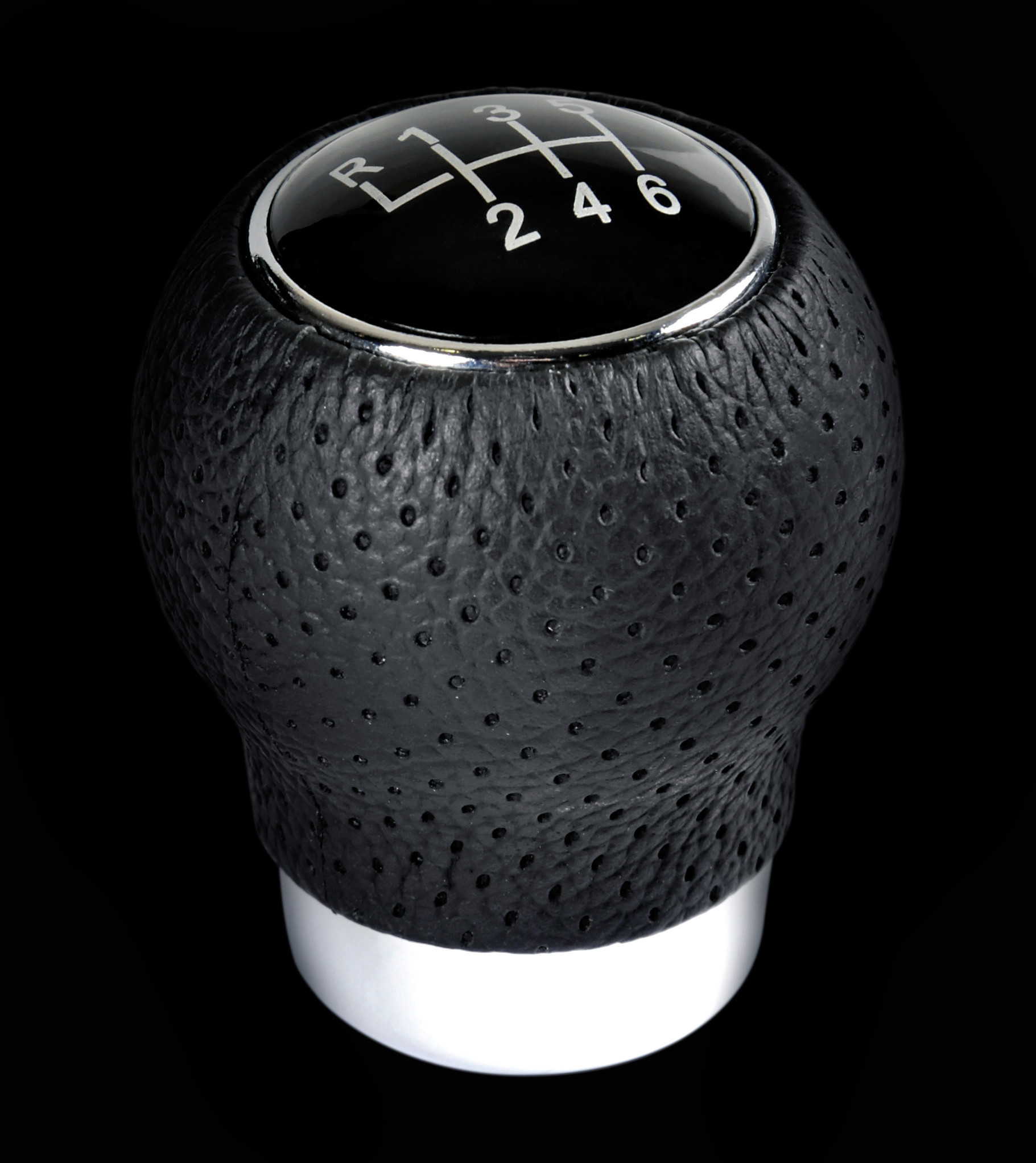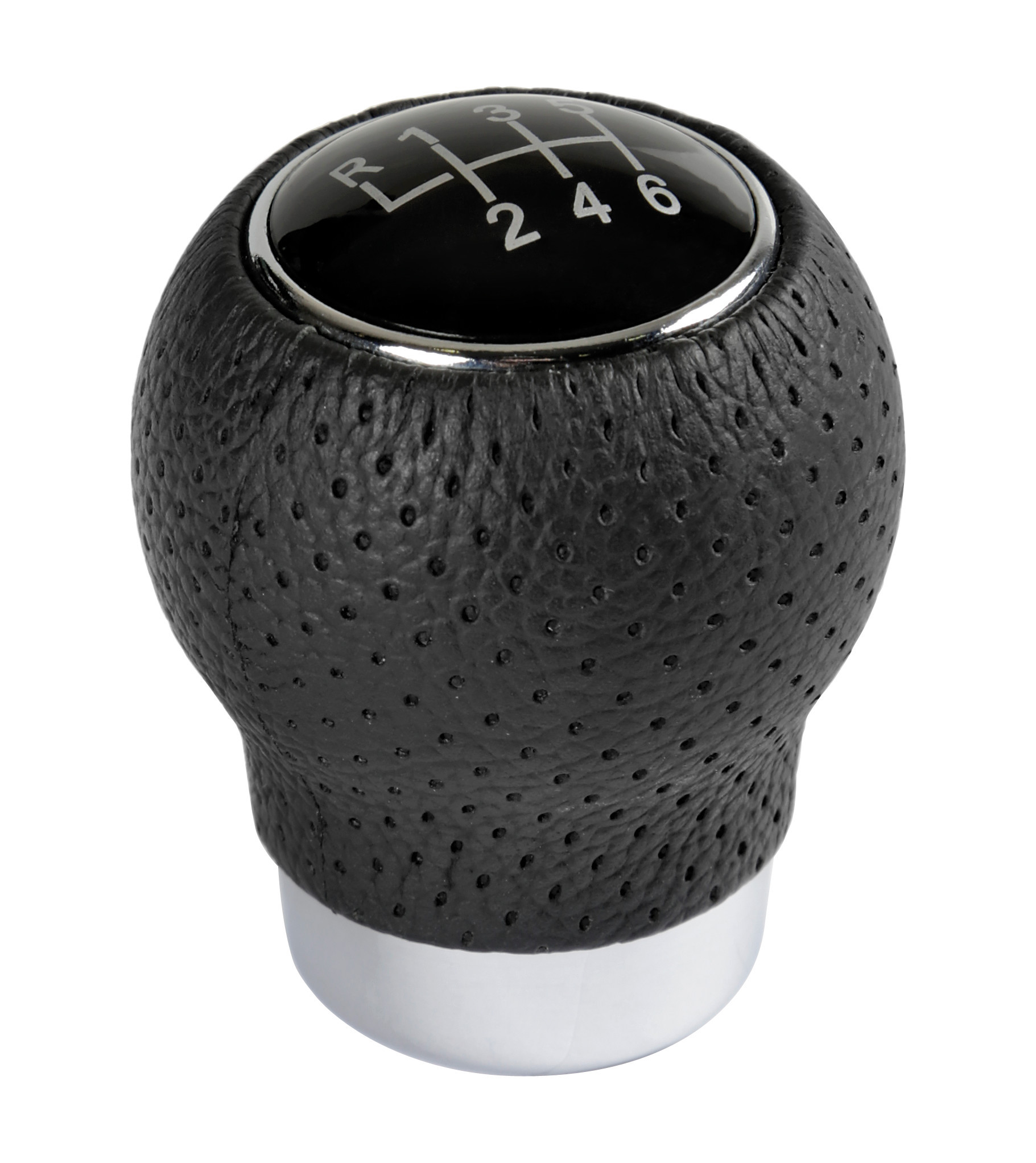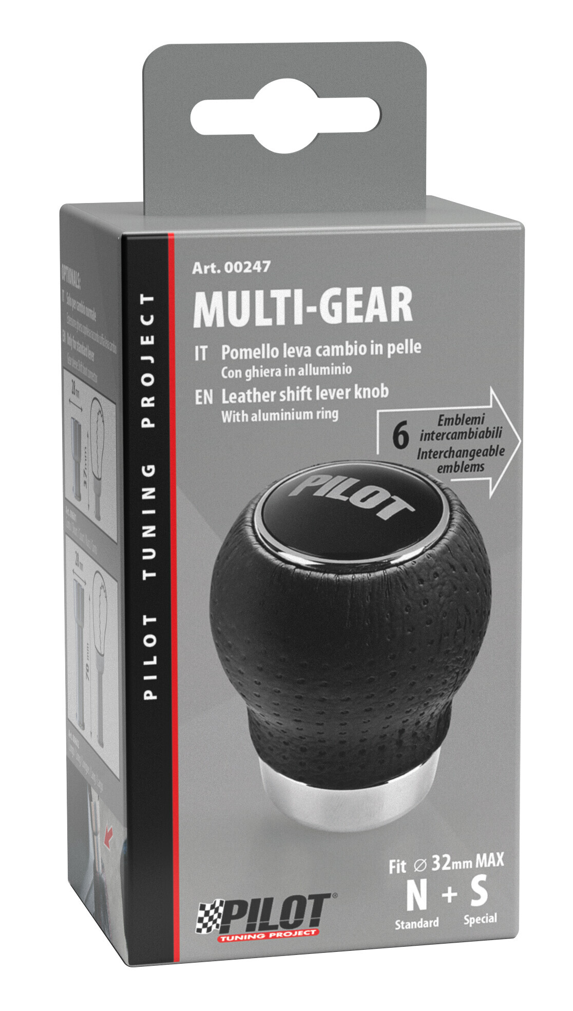 Pomello leva cambio alluminio e pelle. 7 emblemi intercambiabili. Montaggio fai da te tramite kit con adattatori e chiave esagonale in dotazione.