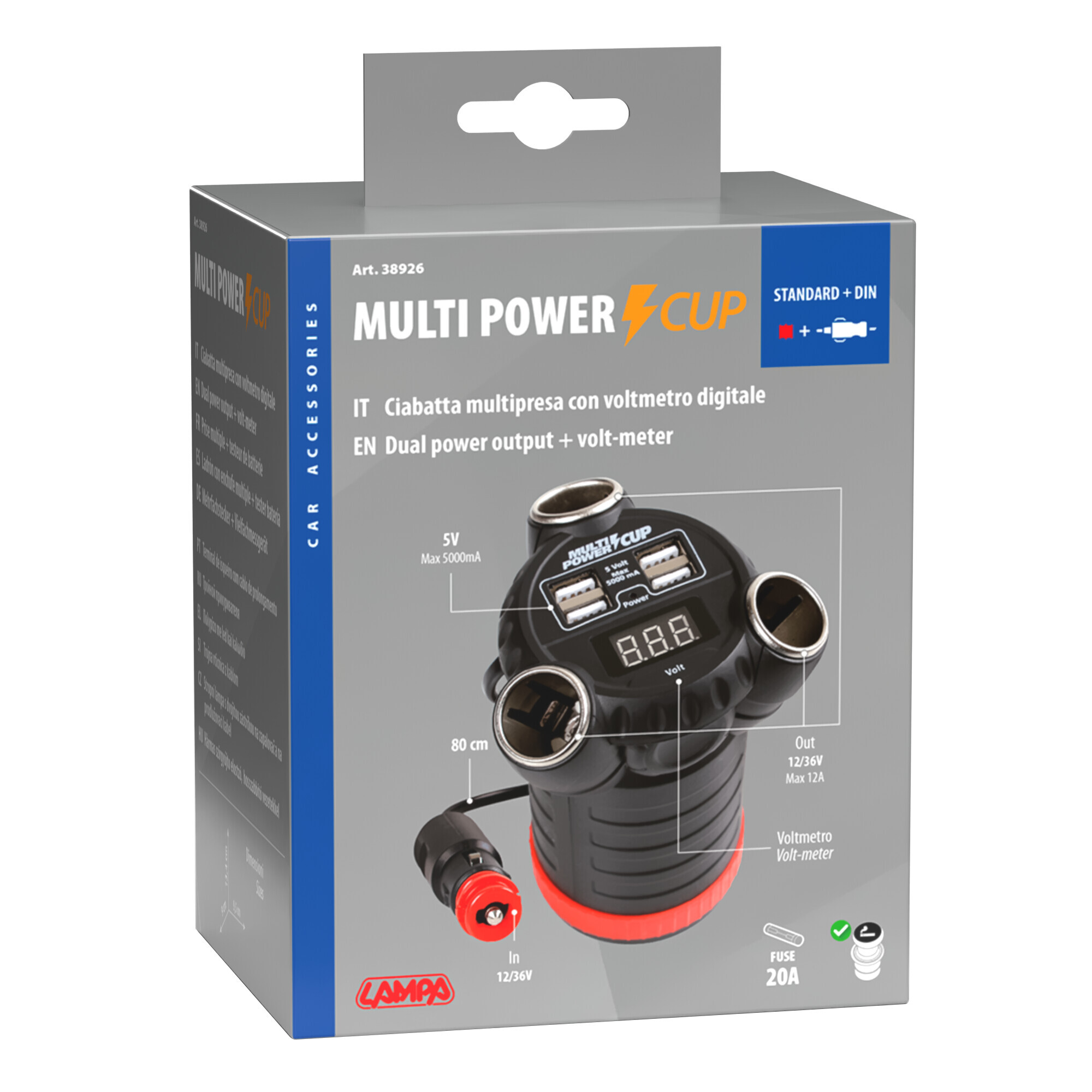 Multi-Power Cup, 3 prese accendisigari + 4 USB e voltmetro, 12/24/36V