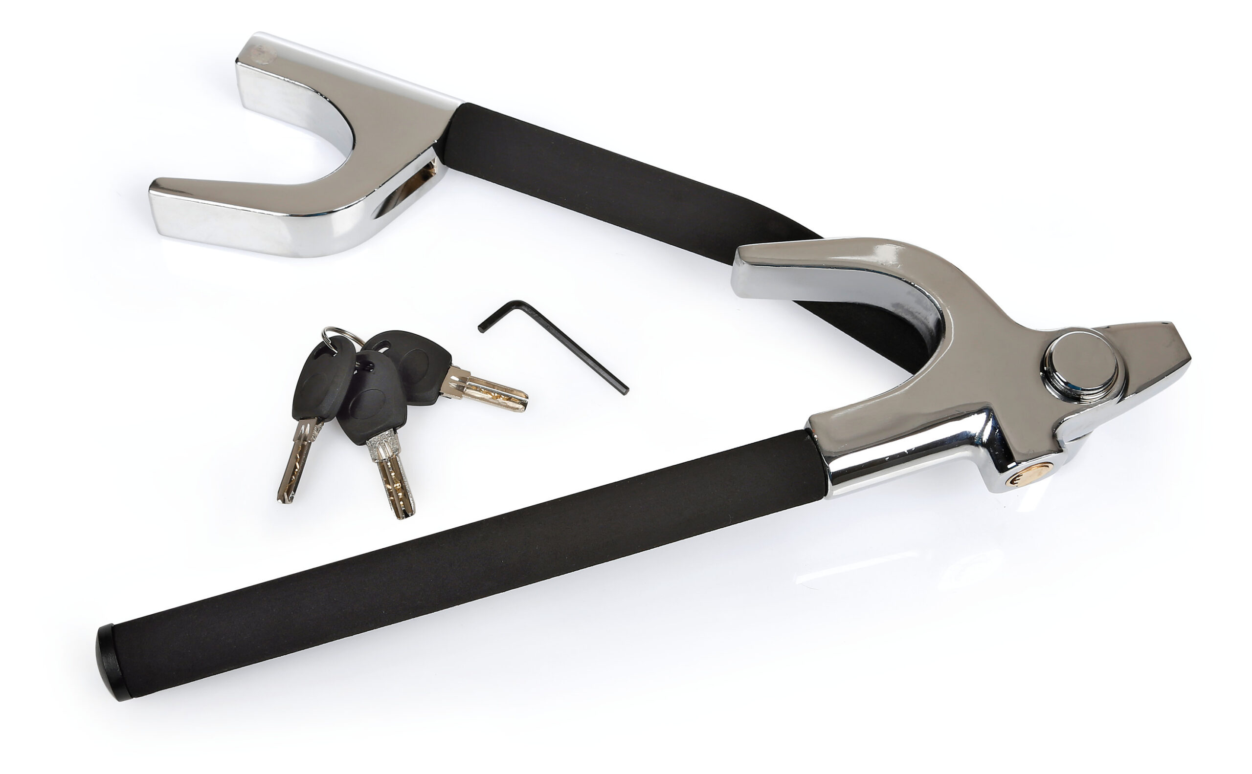 Asta bloccasterzo ripiegabile in acciaio temprato, anti-taglio e serratura antiscasso. Installazione ultrarapida, con blocco automatico. Rivestimento in gomma-spugna e finitura al cromo