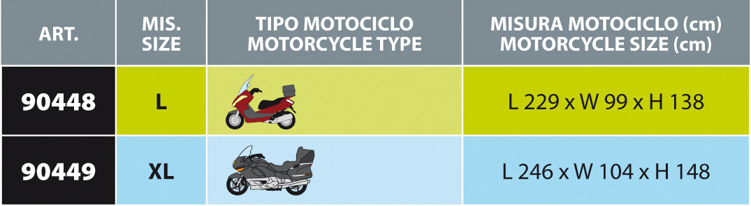 Con sagomatura per moto/scooter con parabrezza e bauletto. Esterno in resistente PVC e interno in morbido tessuto non tessuto.