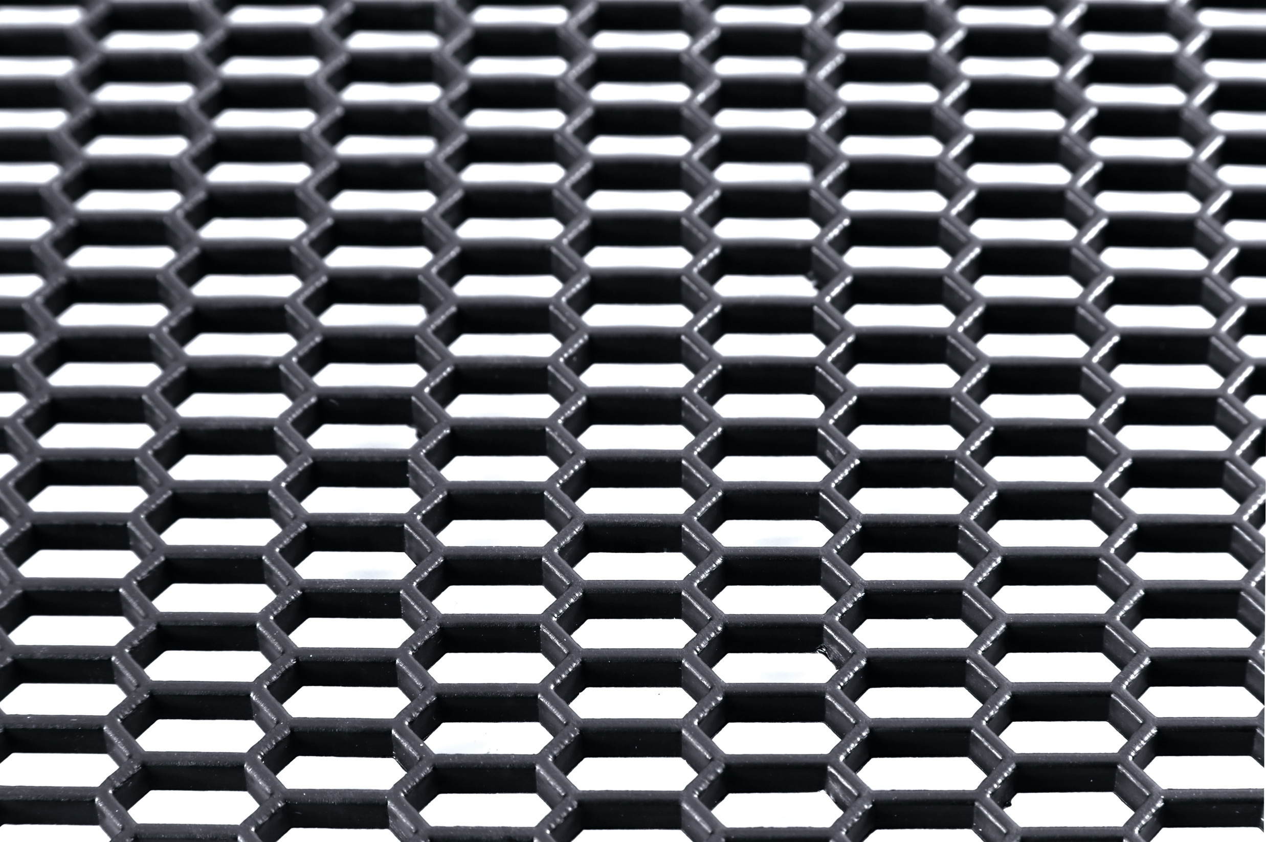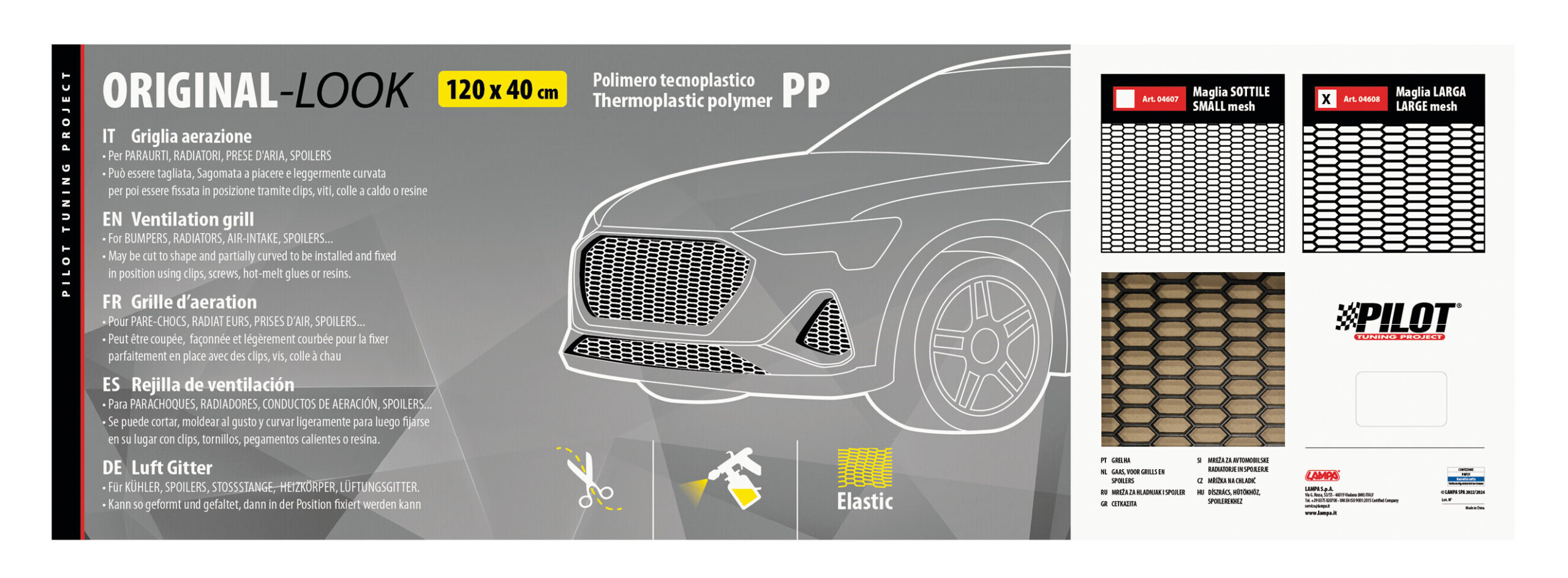 In polimero tecnoplastico. Per paraurti, radiatori, prese d’aria, spoilers. Può essere tagliata, sagomata a piacere e leggermente curvata per poi essere fissata in posizione tramite clips, viti, colle a caldo o resine