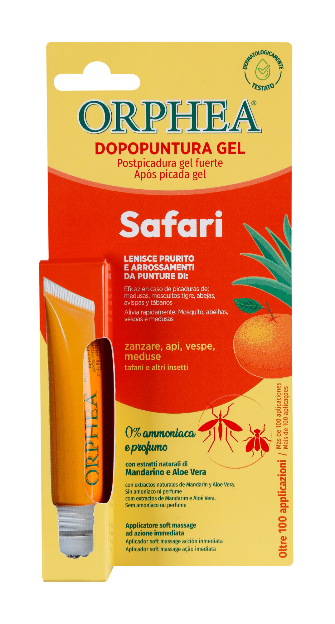 Dopopuntura Gel safari Formula dona sollievo rapido dalle punture di zanzare, zanzara tigre, api, vespe e altri insetti. E’ efficace anche contro le urticazioni da meduse ed agenti urticanti in genere. Gli estratti naturali di Mandarino ed Aloe contenuti nella formulazione svolgono un’azione lenitiva e decongestionante riducendo il prurito e gli eventuali arrossamenti. La formula non contiene né ammoniaca né profumo ed è quindi particolarmente delicata. E’ dermatologicamente testata. L’innovativo applicatore SOFT MASSAGE permette di calibrare perfettamente la fuoriuscita del prodotto e di applicarlo con precisione sull’area su cui è necessario intervenire.