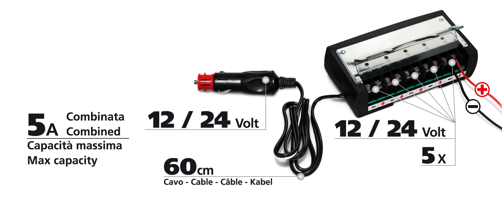 Le 5 spie a led indicano quale delle 5 uscite è alimentata. Cavo da 60 cm.