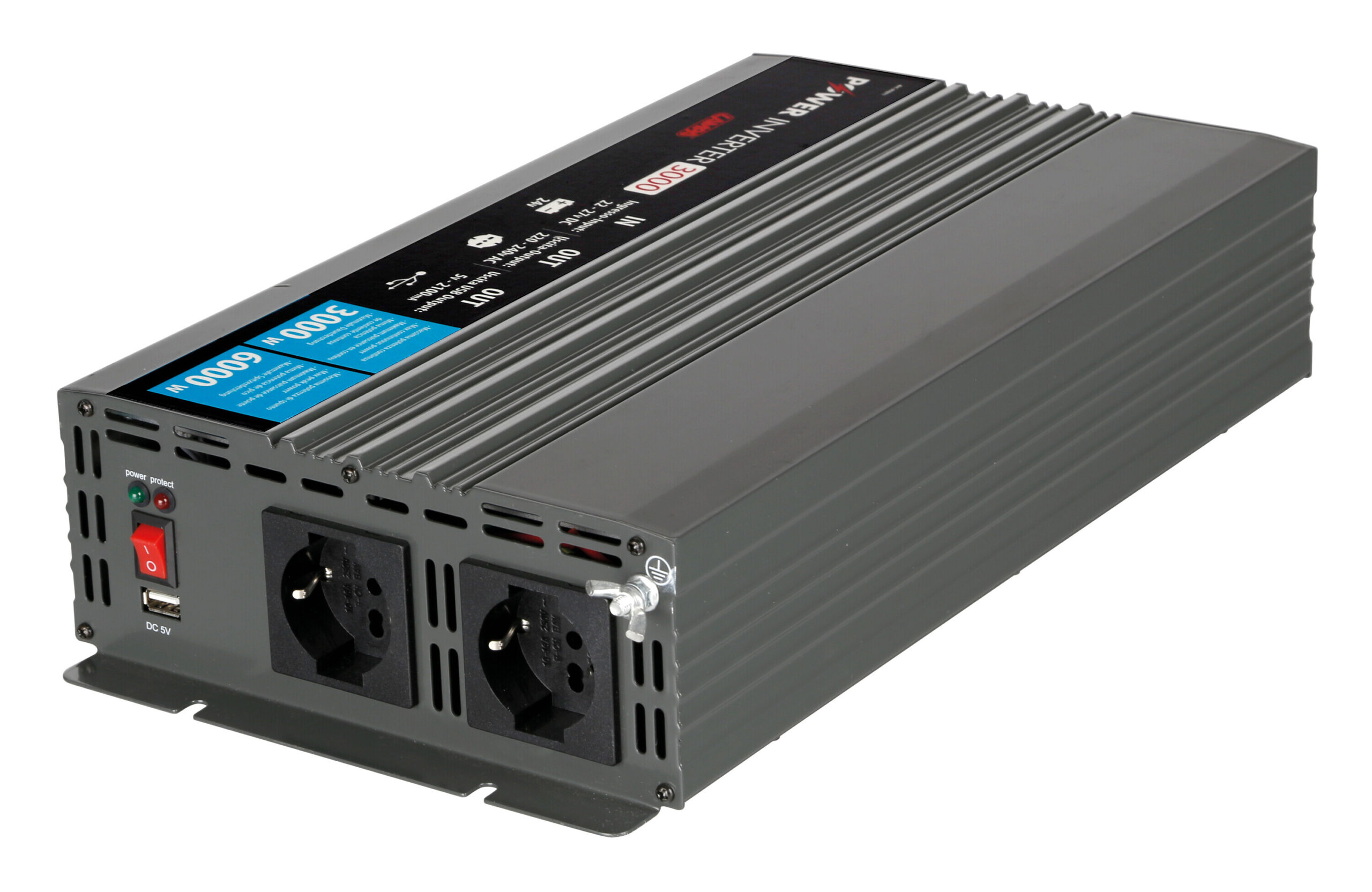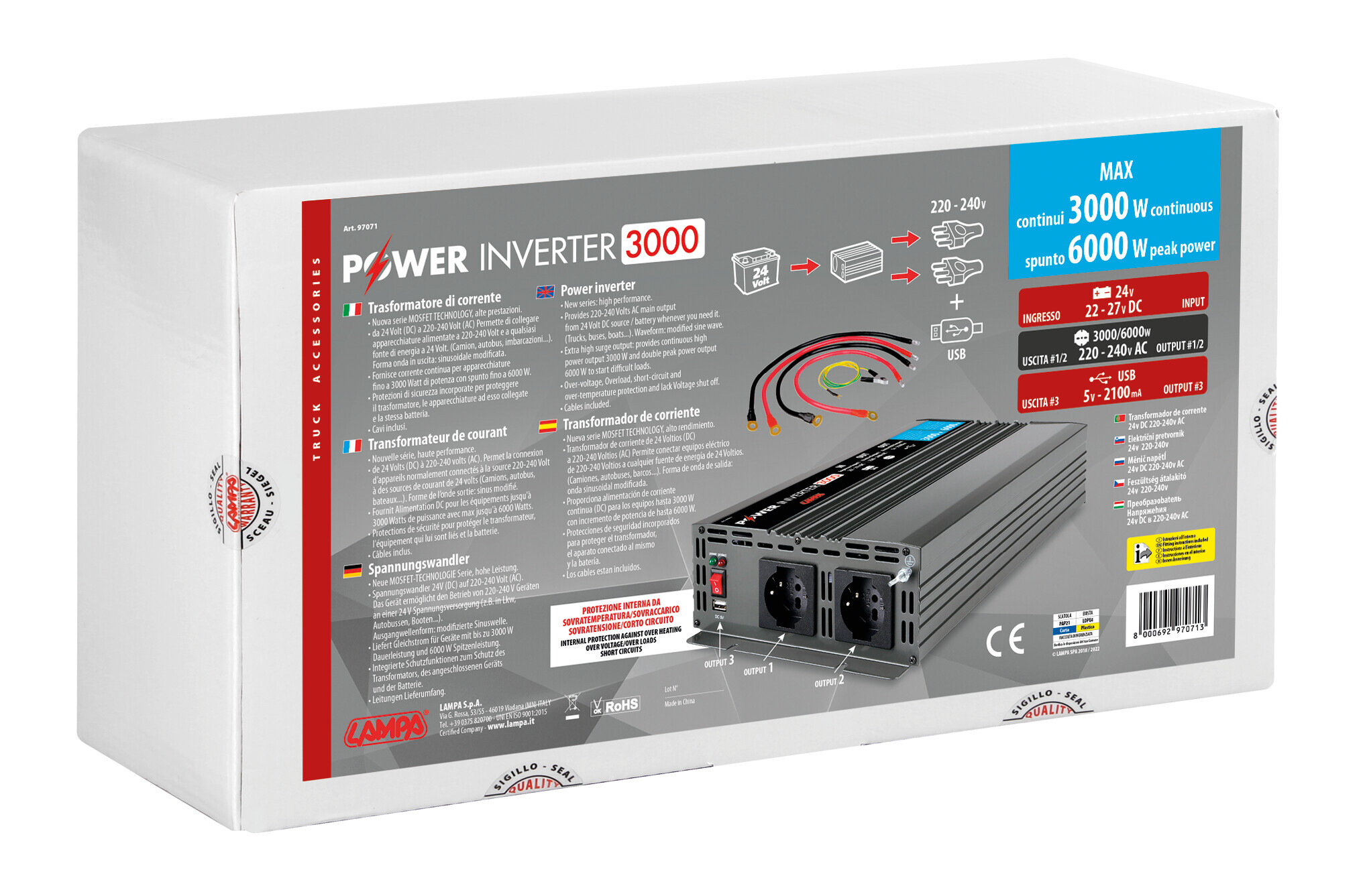 Assorbimento massimo 3000W continuo / 6000W di picco. Trasformatore di corrente da 24V a 220V . Permette di collegare apparecchiature alimentate a 220V a qualsiasi fonte di energia da 24V. Struttura in lega di alluminio. Protezione contro i corto circuiti. Forma onda in uscita: sinusoidale modificata. Doppia presa tipo Schuko 3 fori