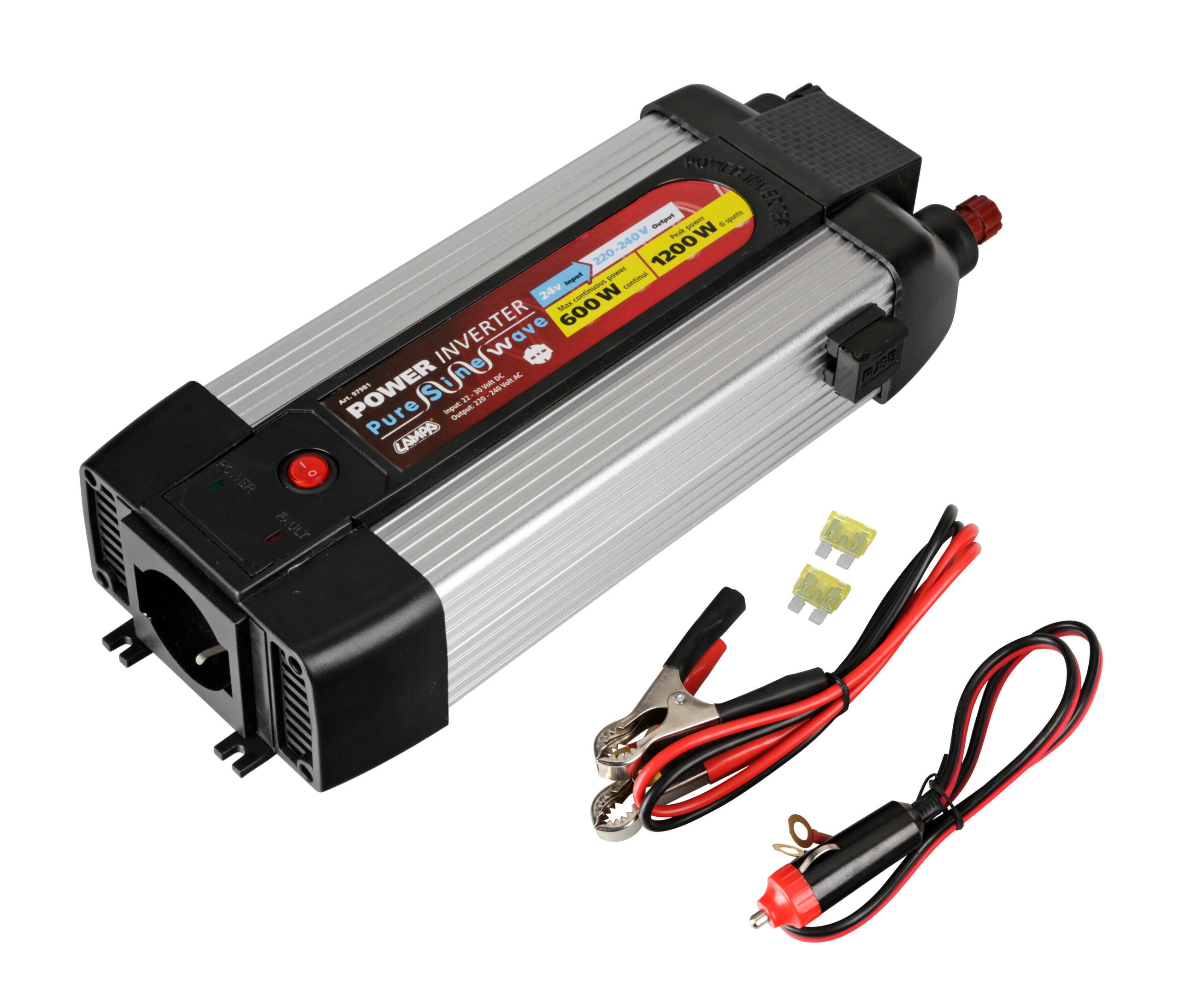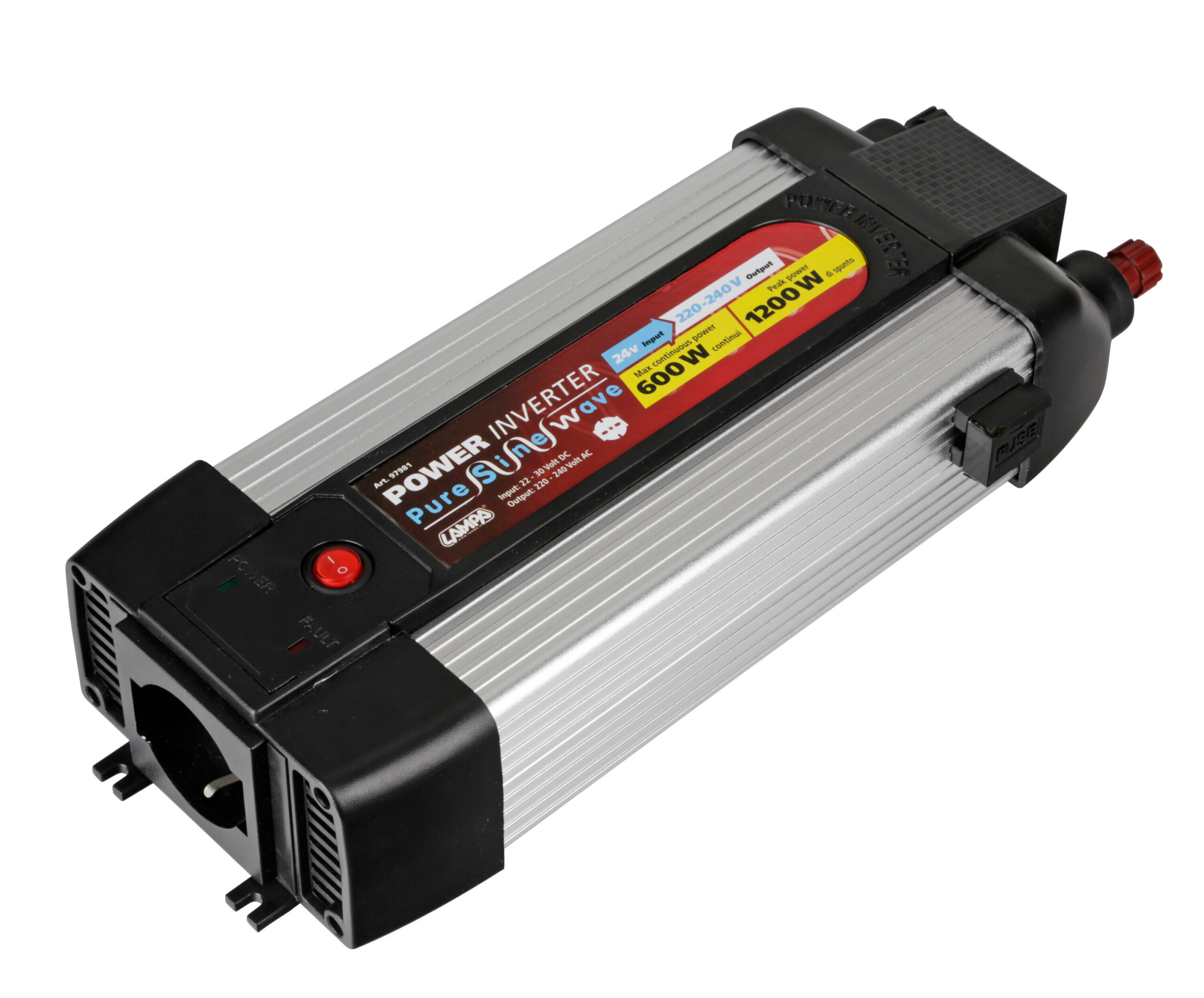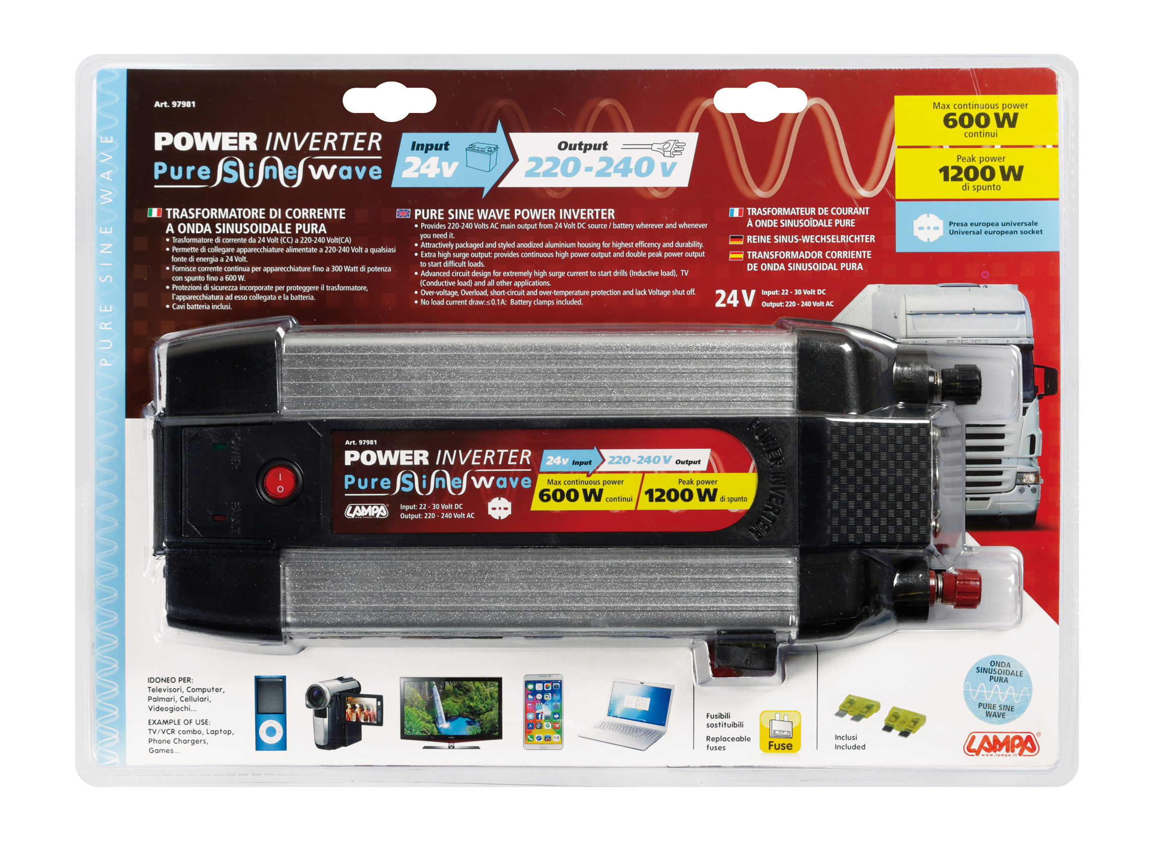 • Permette di collegare apparecchiature alimentate a 220-240V a qualsiasi fonte di energia a 24V (Autovetture, furgoni, camper, imbarcazioni…).