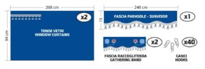In microfibra 200g. Composto da: 2 tende vetri, 2 fasce raccoglitenda calamitate, 1 fascia parasole, 40 ganci in plastica. Chiusura cabina sui tre lati. Universale per la maggior parte dei camion a cabina standard