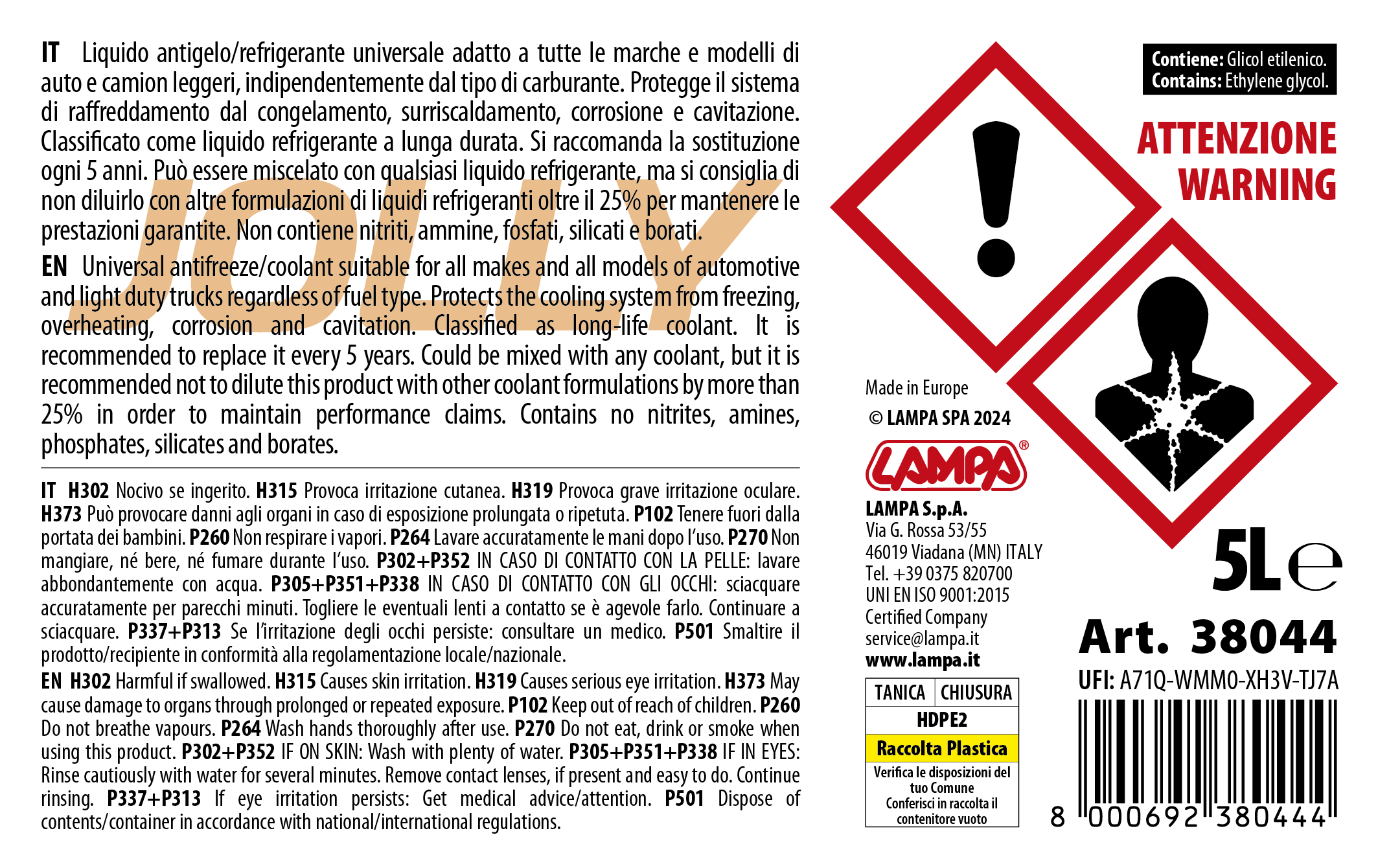 Liquido antigelo/refrigerante universale adatto a tutte le marche e modelli di auto e camion leggeri, indipendentemente dal tipo di carburante. Protegge il sistema di raffreddamento dal congelamento, surriscaldamento, corrosione e cavitazione. Classificato come liquido refrigerante a lunga durata. Si raccomanda la sostituzione ogni 5 anni. Può essere miscelato con qualsiasi liquido refrigerante, ma si consiglia di non diluirlo con altre formulazioni di liquidi refrigeranti oltre il 25% per mantenere le prestazioni garantite. Non contiene nitriti, ammine, fosfati, silicati e borati.