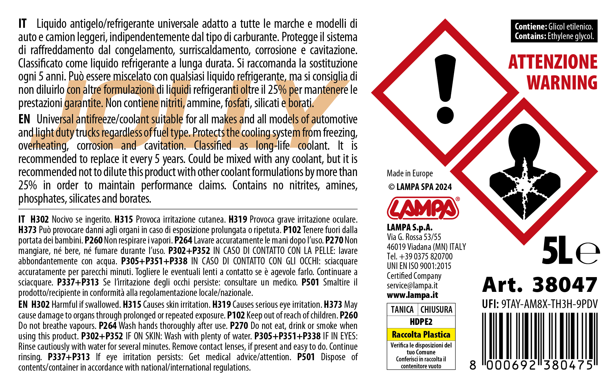Liquido antigelo/refrigerante universale adatto a tutte le marche e modelli di auto e camion leggeri, indipendentemente dal tipo di carburante. Protegge il sistema di raffreddamento dal congelamento, surriscaldamento, corrosione e cavitazione. Classificato come liquido refrigerante a lunga durata. Si raccomanda la sostituzione ogni 5 anni. Può essere miscelato con qualsiasi liquido refrigerante, ma si consiglia di non diluirlo con altre formulazioni di liquidi refrigeranti oltre il 25% per mantenere le prestazioni garantite. Non contiene nitriti, ammine, fosfati, silicati e borati.
