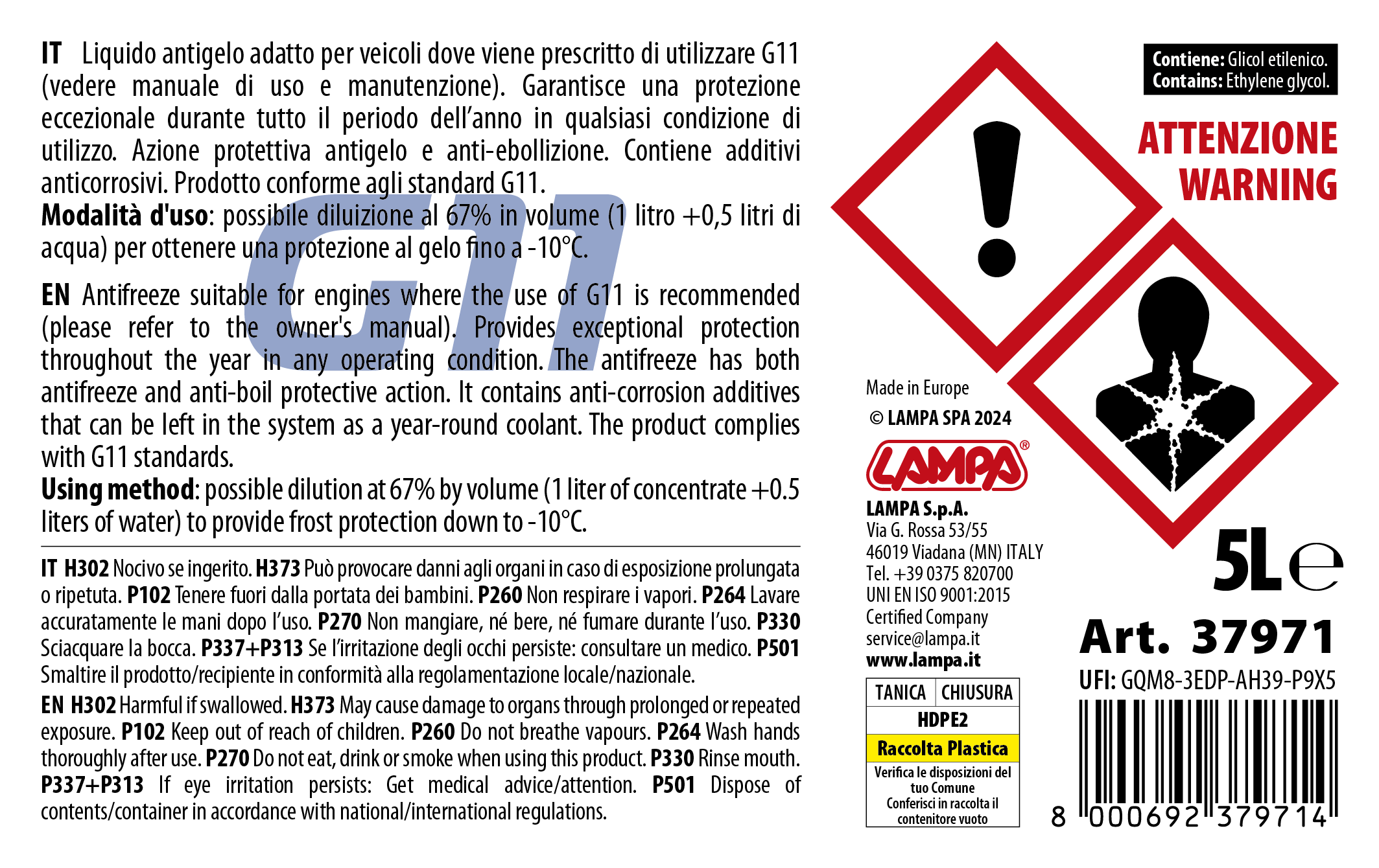 Liquido antigelo pronto all’uso adatto per veicoli dove viene prescritto di utilizzare G11. Garantisce una protezione eccezionale durante tutto il periodo dell’anno in qualsiasi condizione di utilizzo. Azione protettiva antigelo e anti-ebollizione. Contiene additivi anticorrosivi. Prodotto conforme agli standard G11