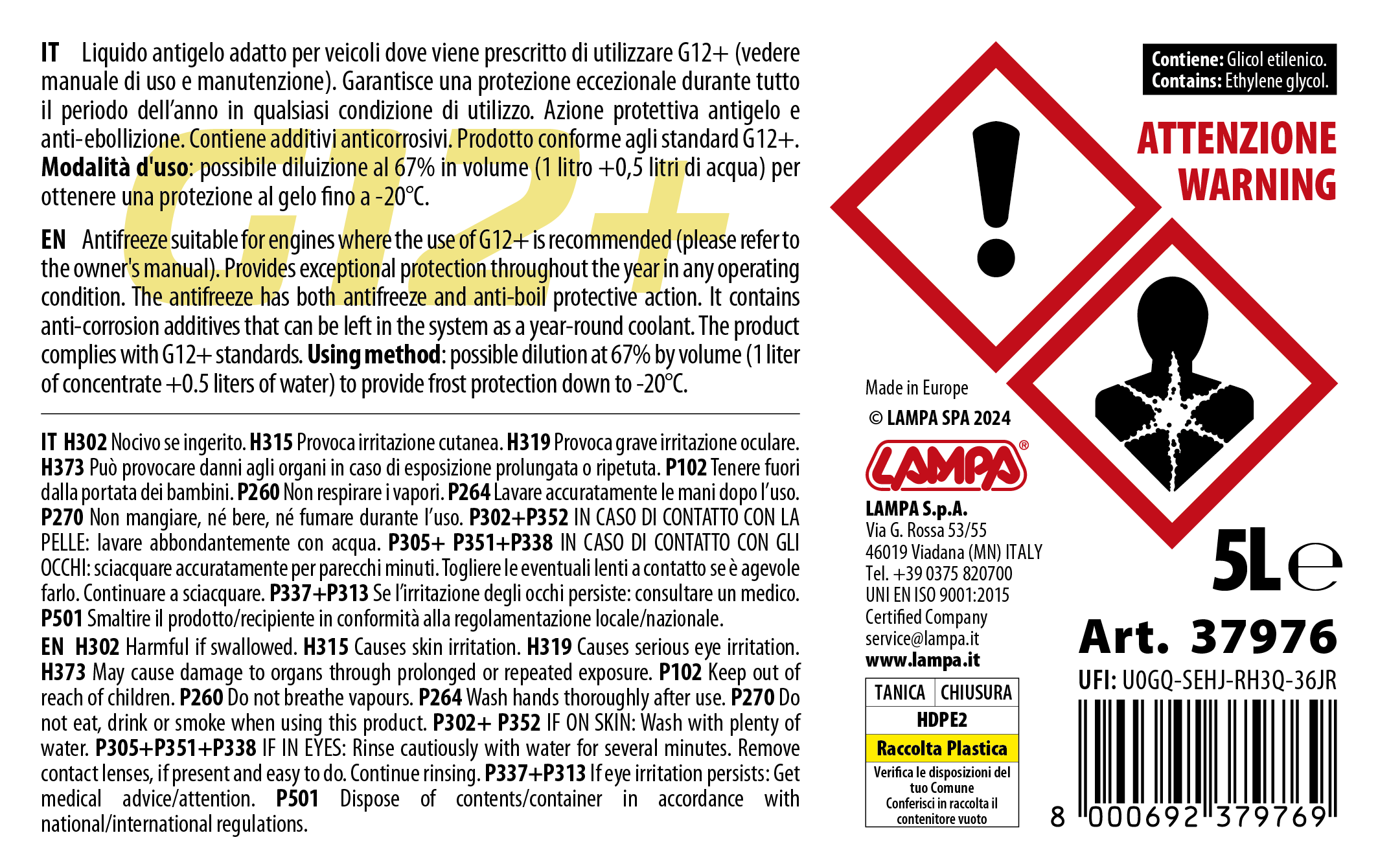 Liquido antigelo pronto all’uso adatto per veicoli dove viene prescritto di utilizzare G12+. Garantisce una protezione eccezionale durante tutto il periodo dell’anno in qualsiasi condizione di utilizzo. Azione protettiva antigelo e anti-ebollizione. Contiene additivi anticorrosivi. Prodotto conforme agli standard G12+