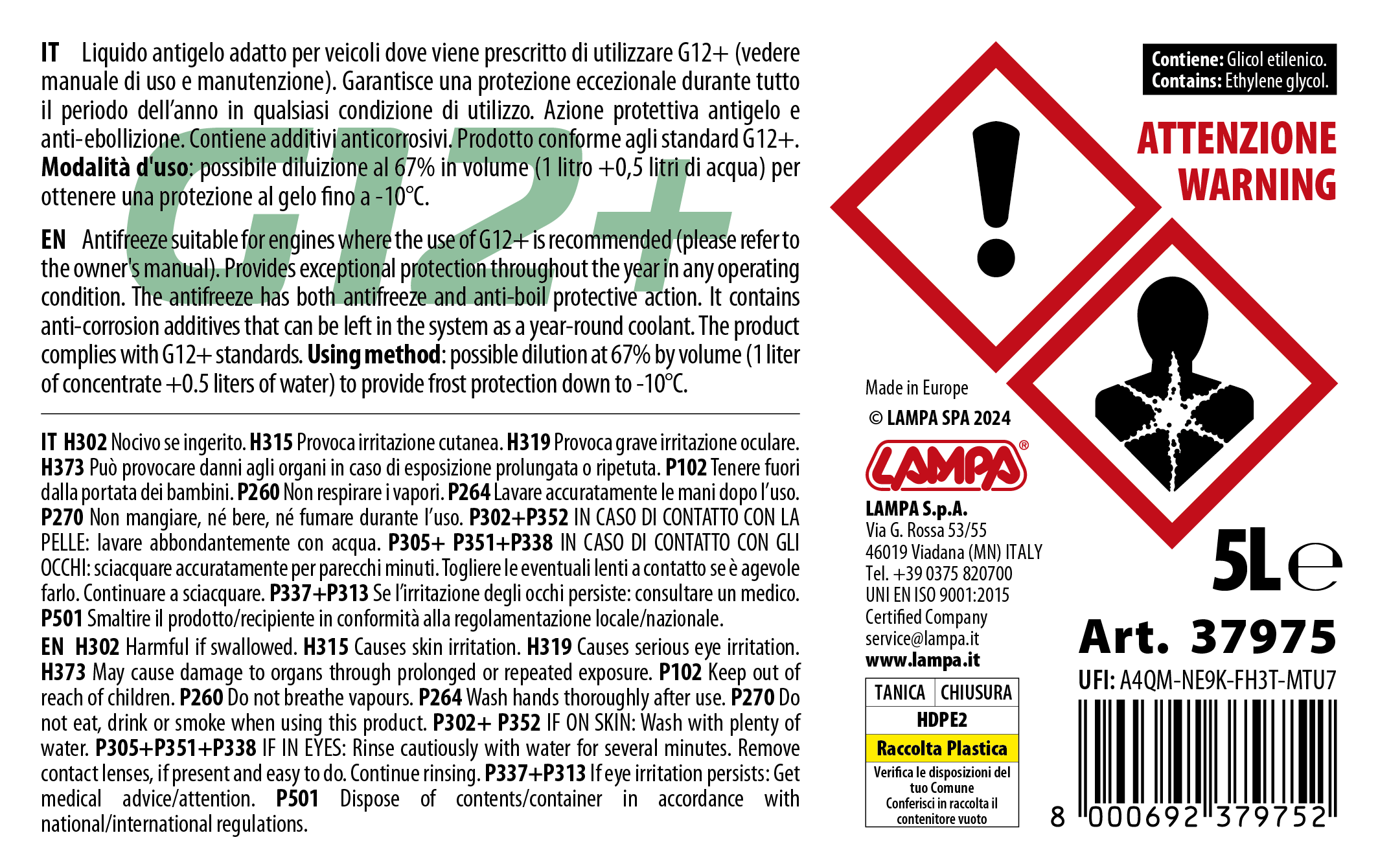 Liquido antigelo pronto all’uso adatto per veicoli dove viene prescritto di utilizzare G12+. Garantisce una protezione eccezionale durante tutto il periodo dell’anno in qualsiasi condizione di utilizzo. Azione protettiva antigelo e anti-ebollizione. Contiene additivi anticorrosivi. Prodotto conforme agli standard G12+