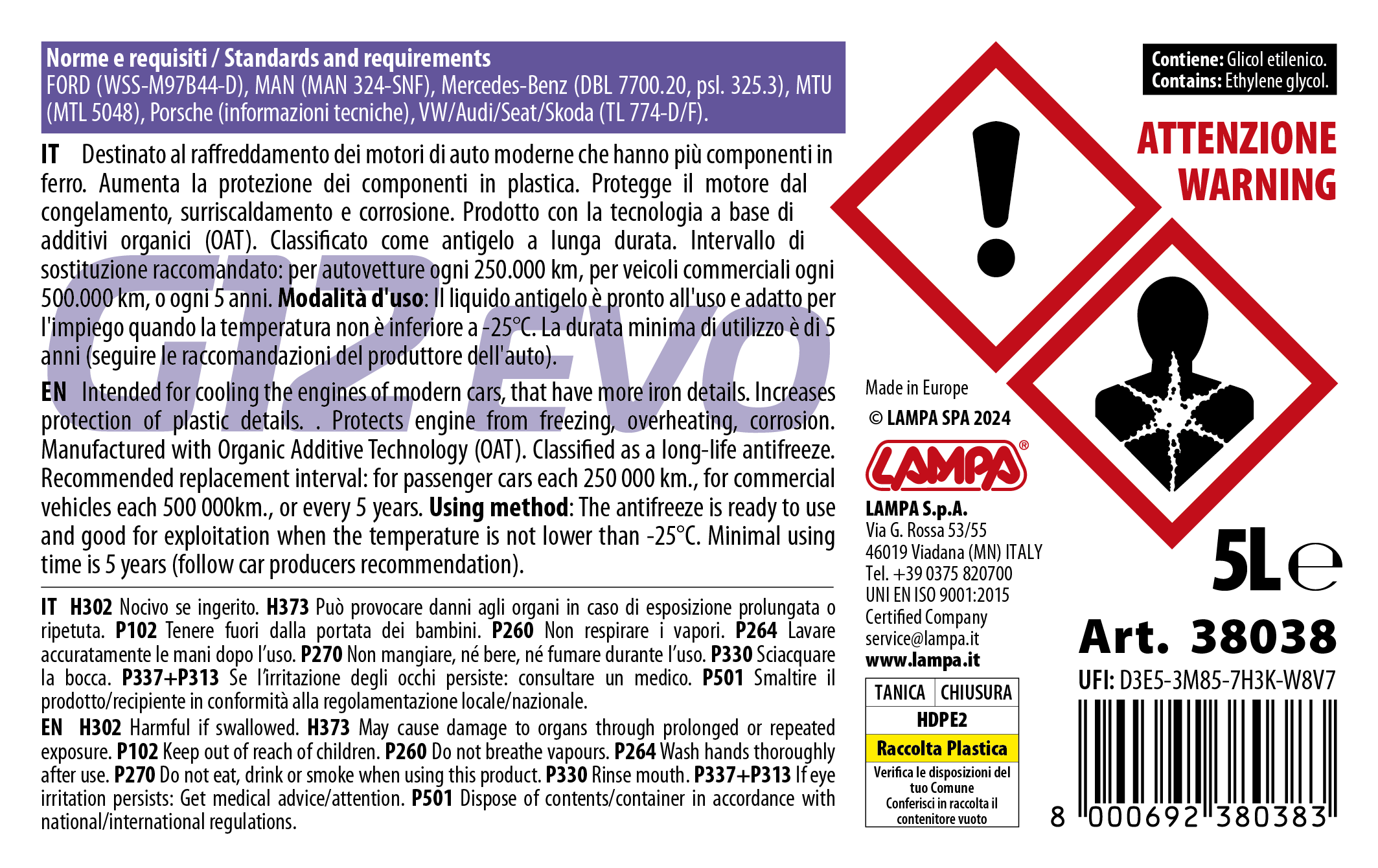 Destinato al raffreddamento dei motori di auto moderne che hanno più componenti in ferro. Aumenta la protezione dei componenti in plastica. Protegge il motore dal congelamento, surriscaldamento e corrosione. Prodotto con la tecnologia a base di additivi organici (OAT). Classificato come antigelo a lunga durata.