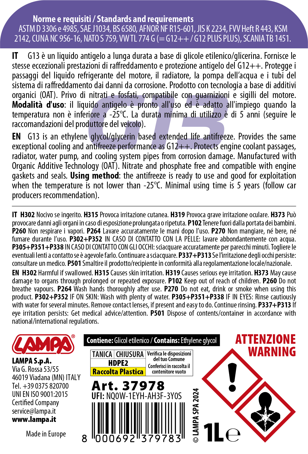 G13 è un liquido antigelo a lunga durata a base di glicole etilenico/glicerina. Fornisce le stesse eccezionali prestazioni di raffreddamento e protezione antigelo del G12++. Protegge i passaggi del liquido refrigerante del motore, il radiatore, la pompa dell’acqua e i tubi del sistema di raffreddamento dai danni da corrosione. Prodotto con tecnologia a base di additivi organici (OAT). Privo di nitrati e fosfati, compatibile con guarnizioni e sigilli del motore