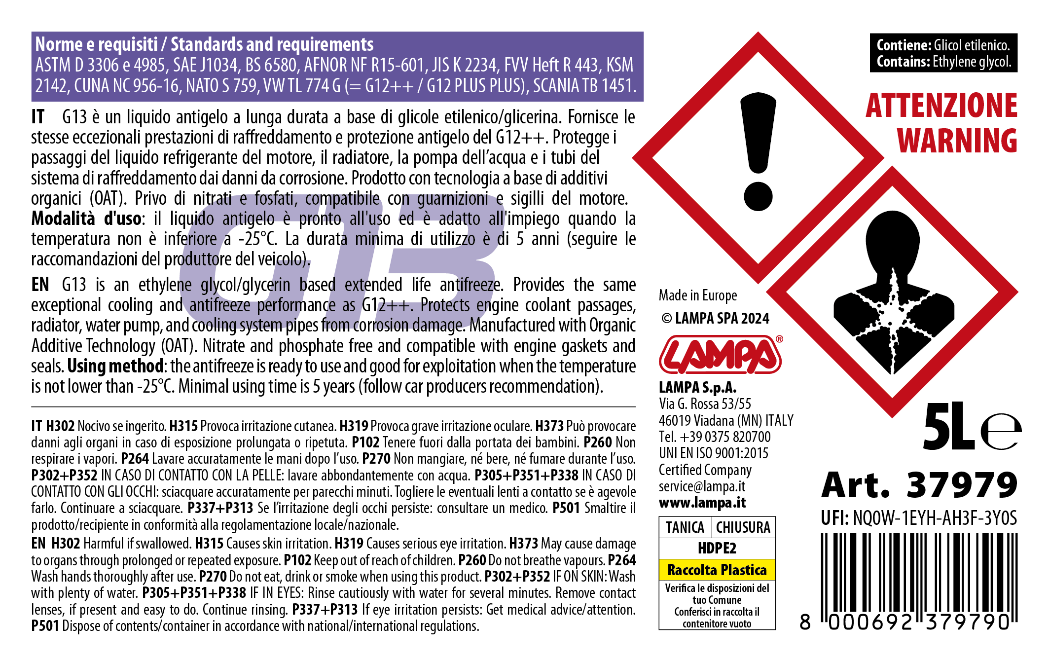 G13 è un liquido antigelo a lunga durata a base di glicole etilenico/glicerina. Fornisce le stesse eccezionali prestazioni di raffreddamento e protezione antigelo del G12++. Protegge i passaggi del liquido refrigerante del motore, il radiatore, la pompa dell’acqua e i tubi del sistema di raffreddamento dai danni da corrosione. Prodotto con tecnologia a base di additivi organici (OAT). Privo di nitrati e fosfati, compatibile con guarnizioni e sigilli del motore. Modalità d’uso: il liquido antigelo è pronto all’uso ed è adatto all’impiego quando la temperatura non è inferiore a -25 °C. La durata minima di utilizzo è di 5 anni (seguire le raccomandazioni del produttore del veicolo).