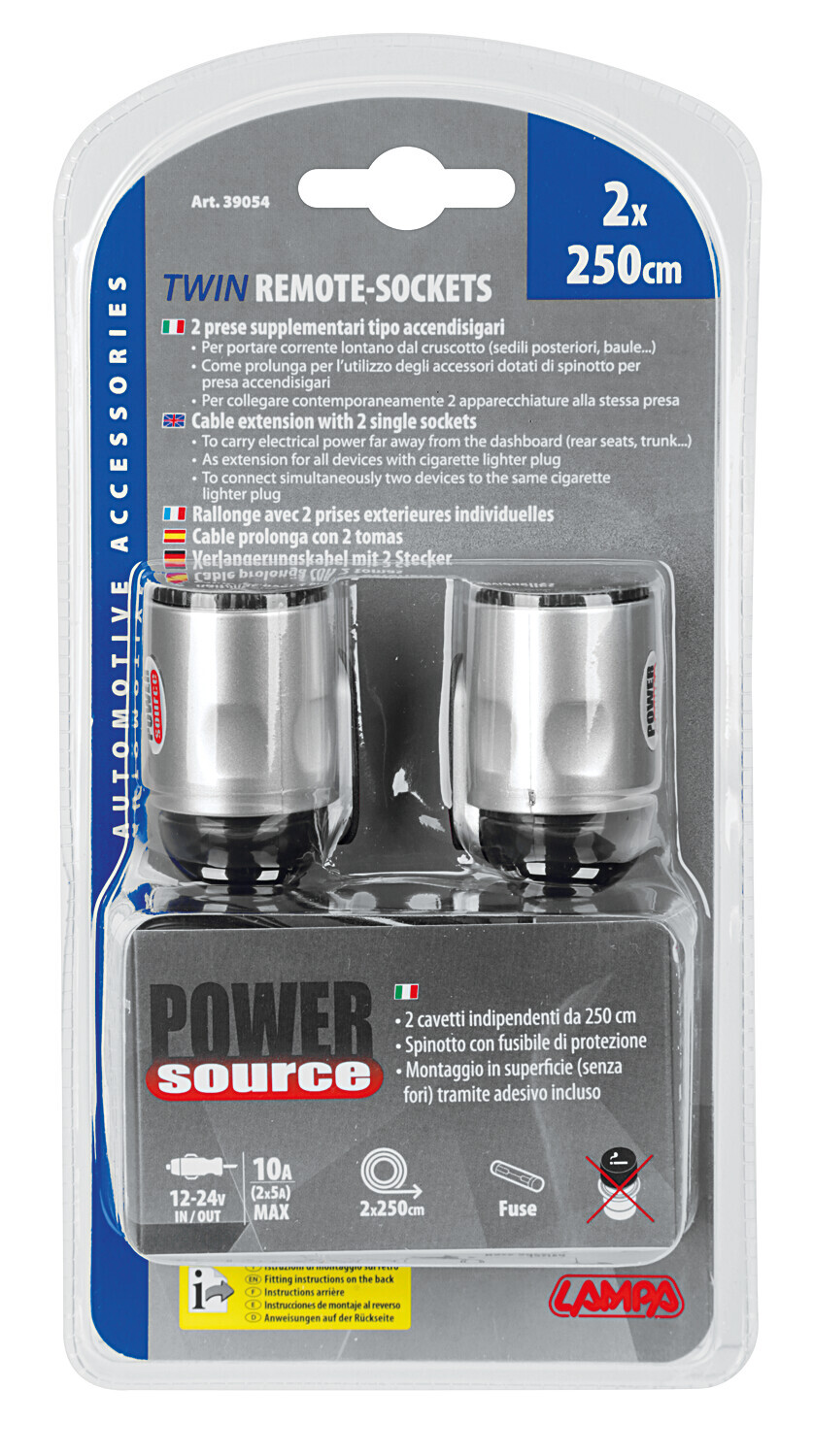 Cavi da 250 cm, fusibile di protezione. Biadesivo