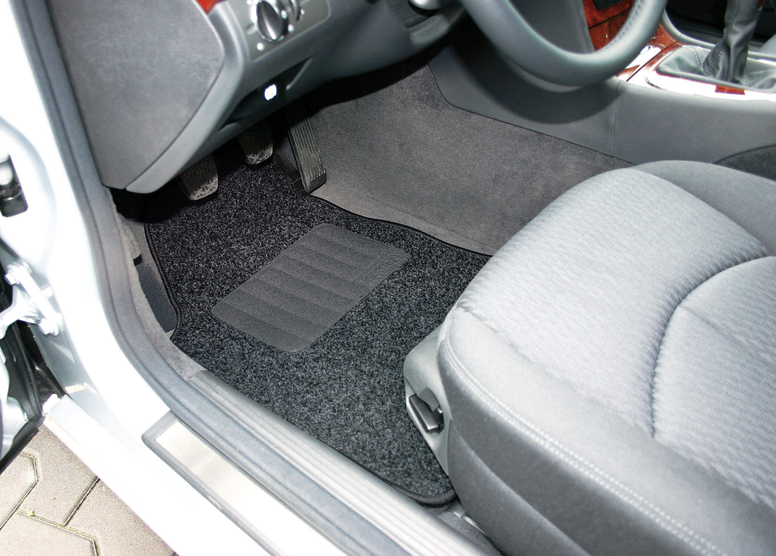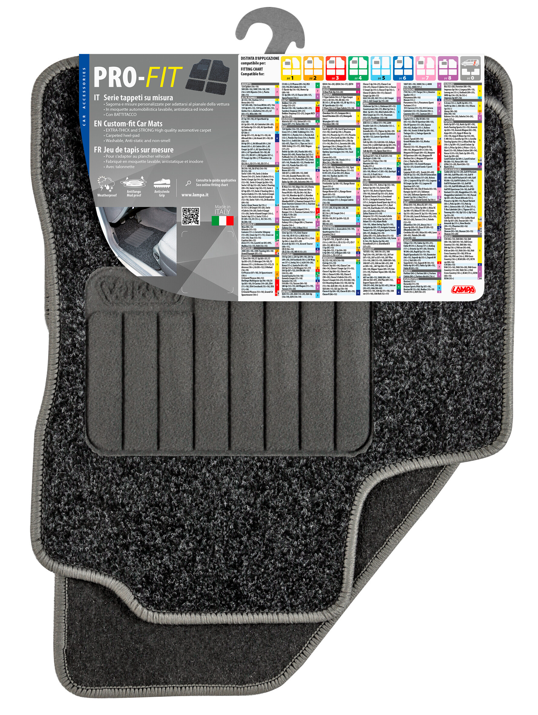 Sagoma e misure personalizzate per adattarsi al pianale della vettura. In moquette automobilistica lavabile, antistatica ed inodore. Con battitacco
