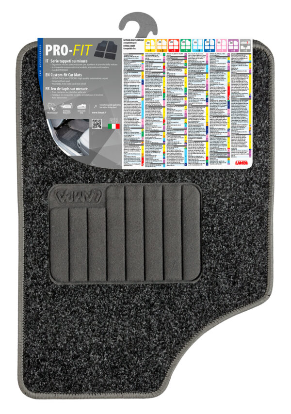 Sagoma e misure personalizzate per adattarsi al pianale della vettura. In moquette automobilistica lavabile, antistatica ed inodore. Con battitacco