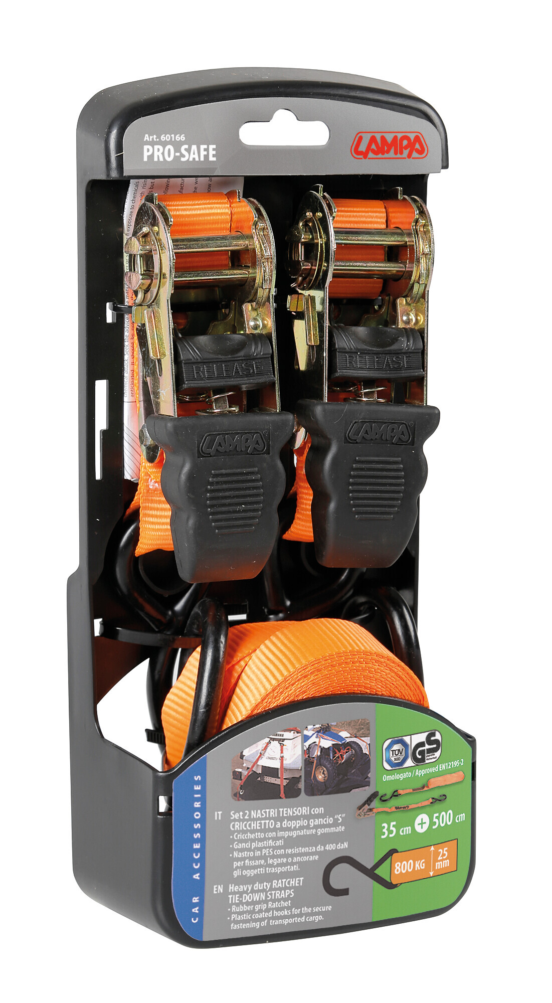 Larghezza nastro 25 mm, 400 daN. Cricchetto con impugnature gommate.