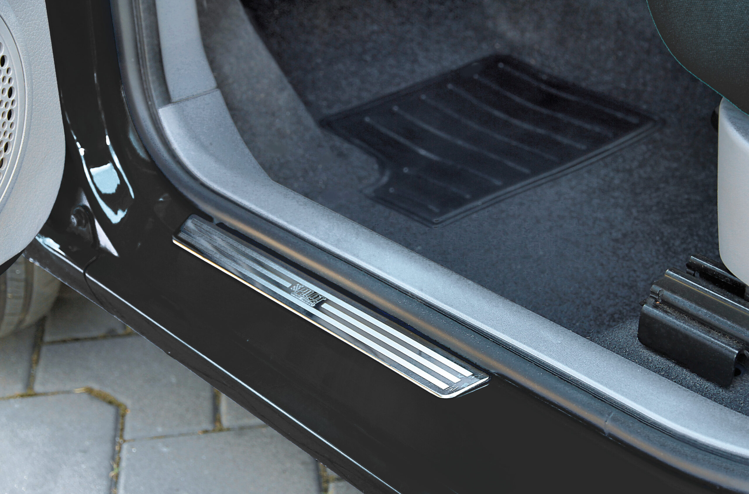 Con zigrinatura. Si applicano tramite adesivo speciale senza praticare alcun foro. Universali per tutte le vetture con profilo battitacco portiera uguale o maggiore di 32 mm
