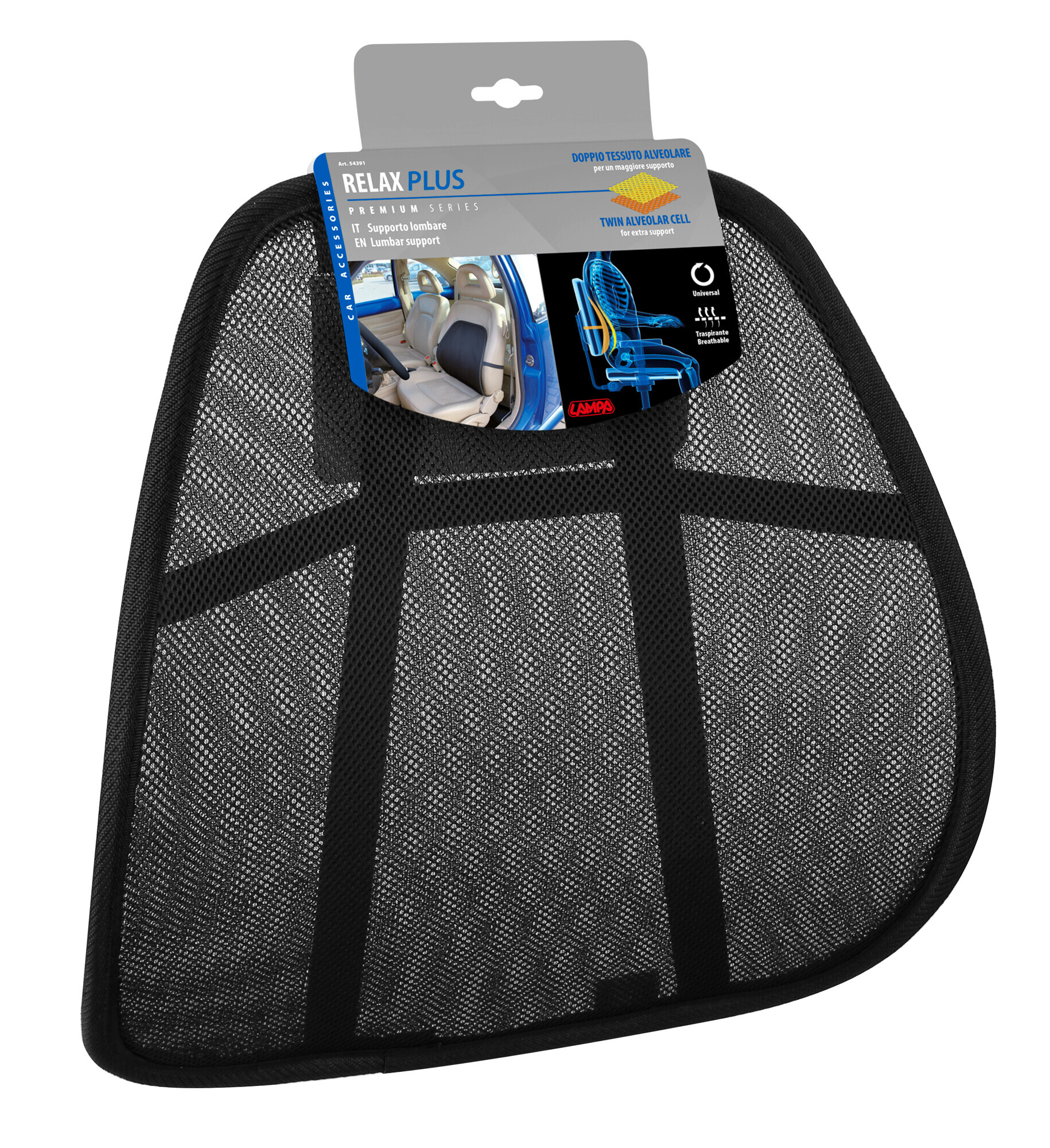 • Posizionato sullo schienale, é un ottimo supporto lombare. Previene il mal di schiena.