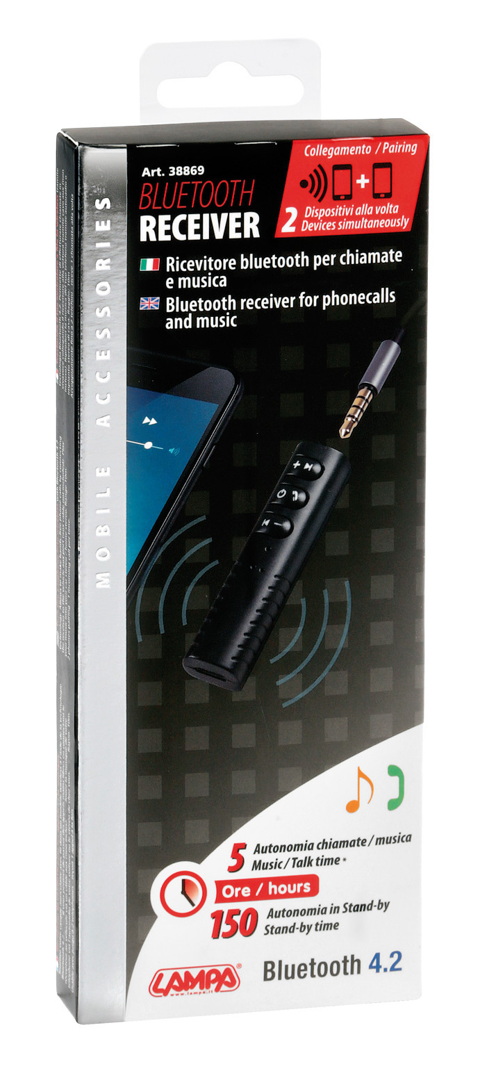 • Permette di effettuare chiamate in vivavoce collegando il ricevitore alla vettura tramite cavo aux (non incluso).