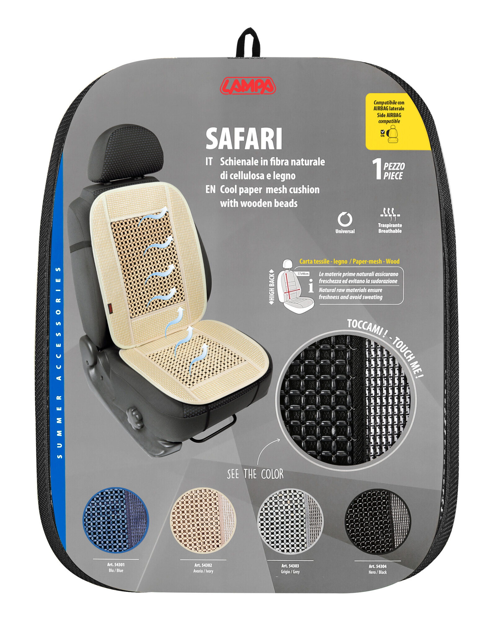 Il top degli schienali estivi perchè prodotto con materie prime naturali. Paglietta di cellulosa (carta) per il contorno e palline di legno che garantiscono il ricambio di aria tra corpo e sedile