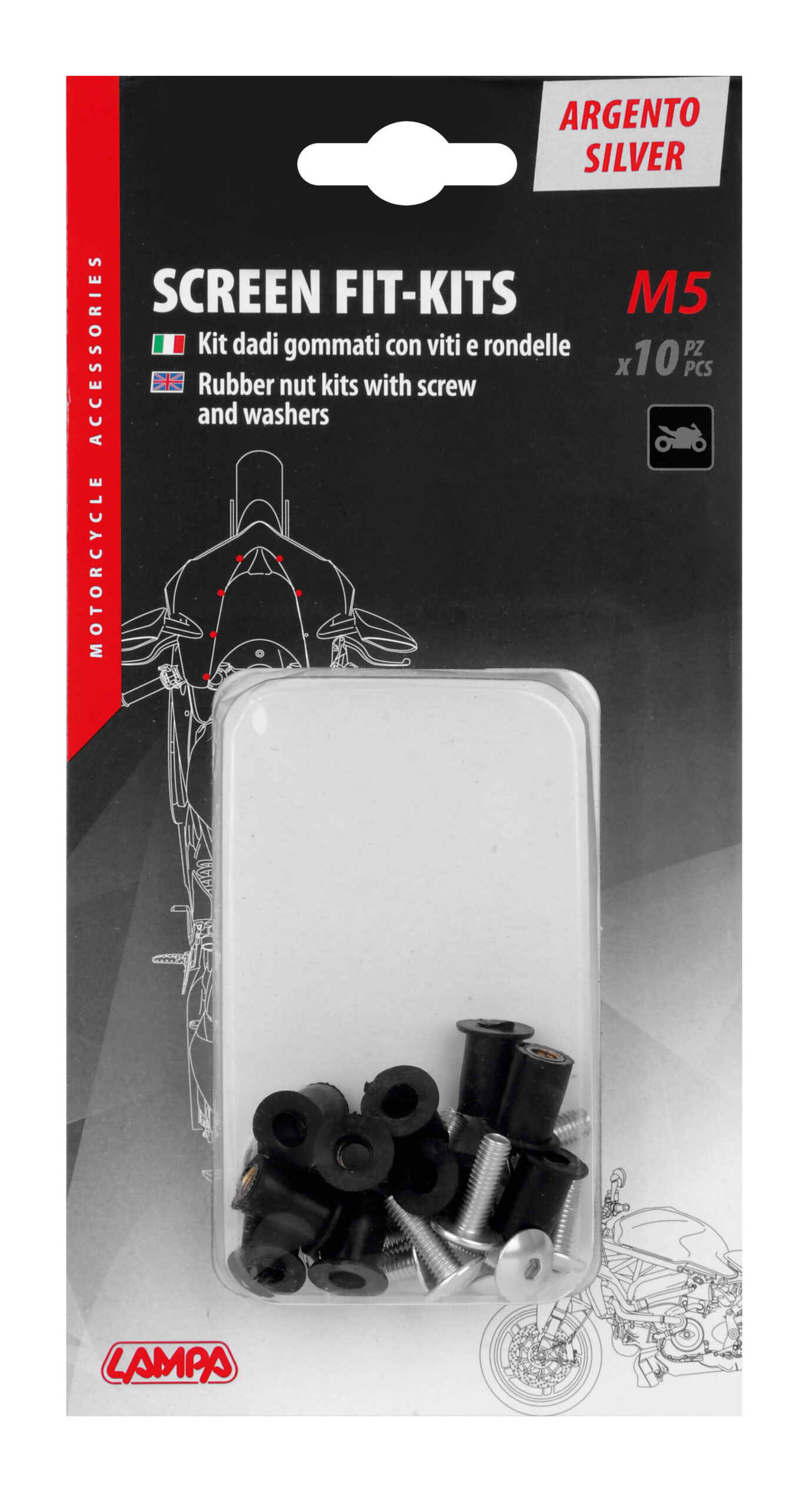 • Set da 10 kit fissaggio per cupolini e carenature moto (ogni kit è composto da vite, rondella e dado gommato)