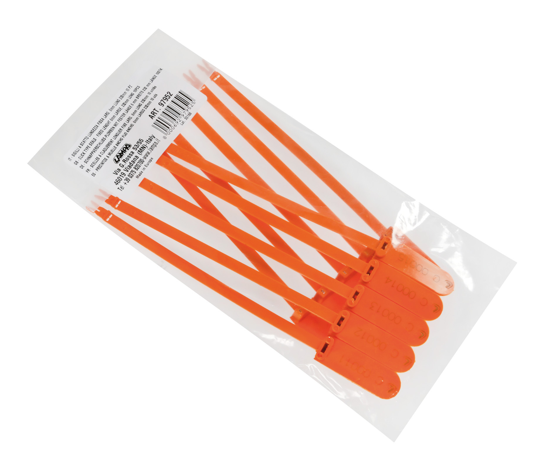 Sigilli monouso piatti autobloccanti a scatto, realizzati in 100% polipropilene. Idonei per molteplici applicazioni: per container, per camion rigidi e telonati. Mantengono le doti di sicurezza per tutta la loro lunghezza. Numerazione progressiva stampata. Colori assortiti.