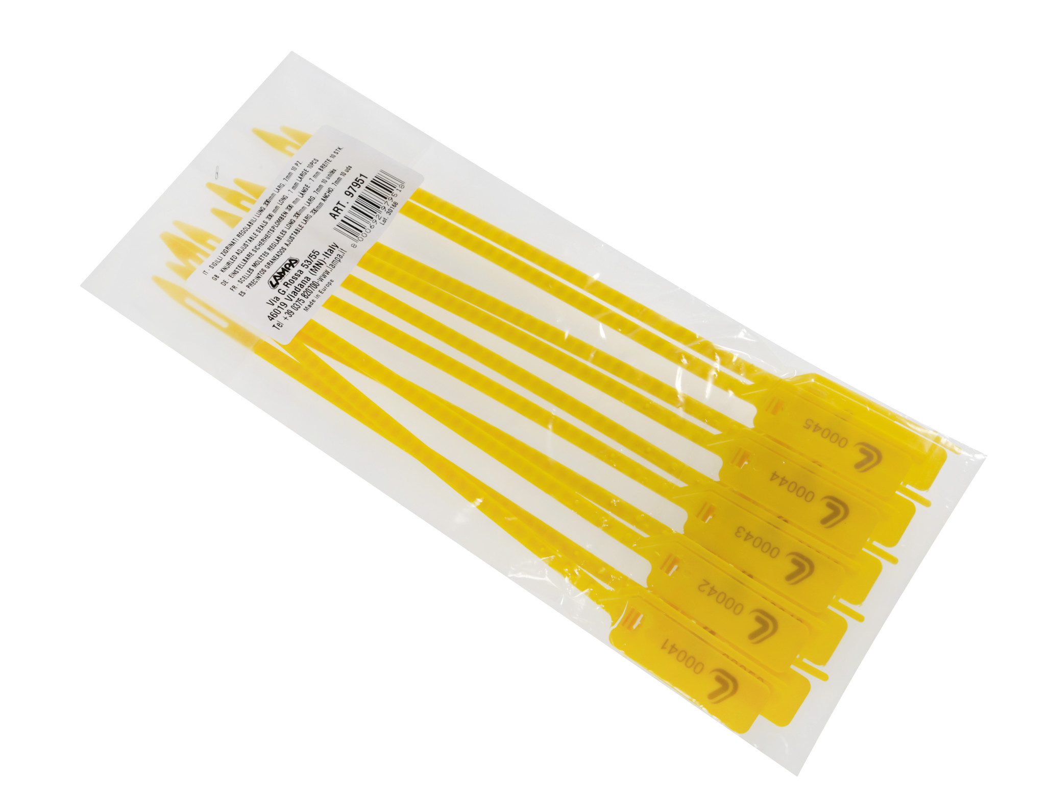 Sigilli monouso, realizzati in 100% polipropilene, zigrinati, facili da usare. Idonei per molteplici applicazioni: per sacchi, container, per camion rigidi e telonati.